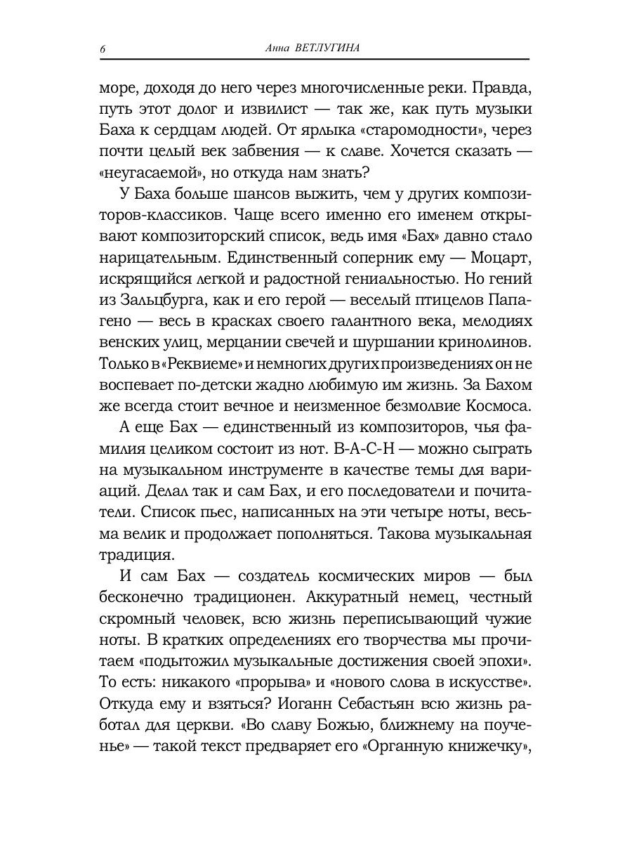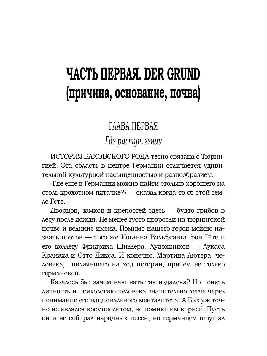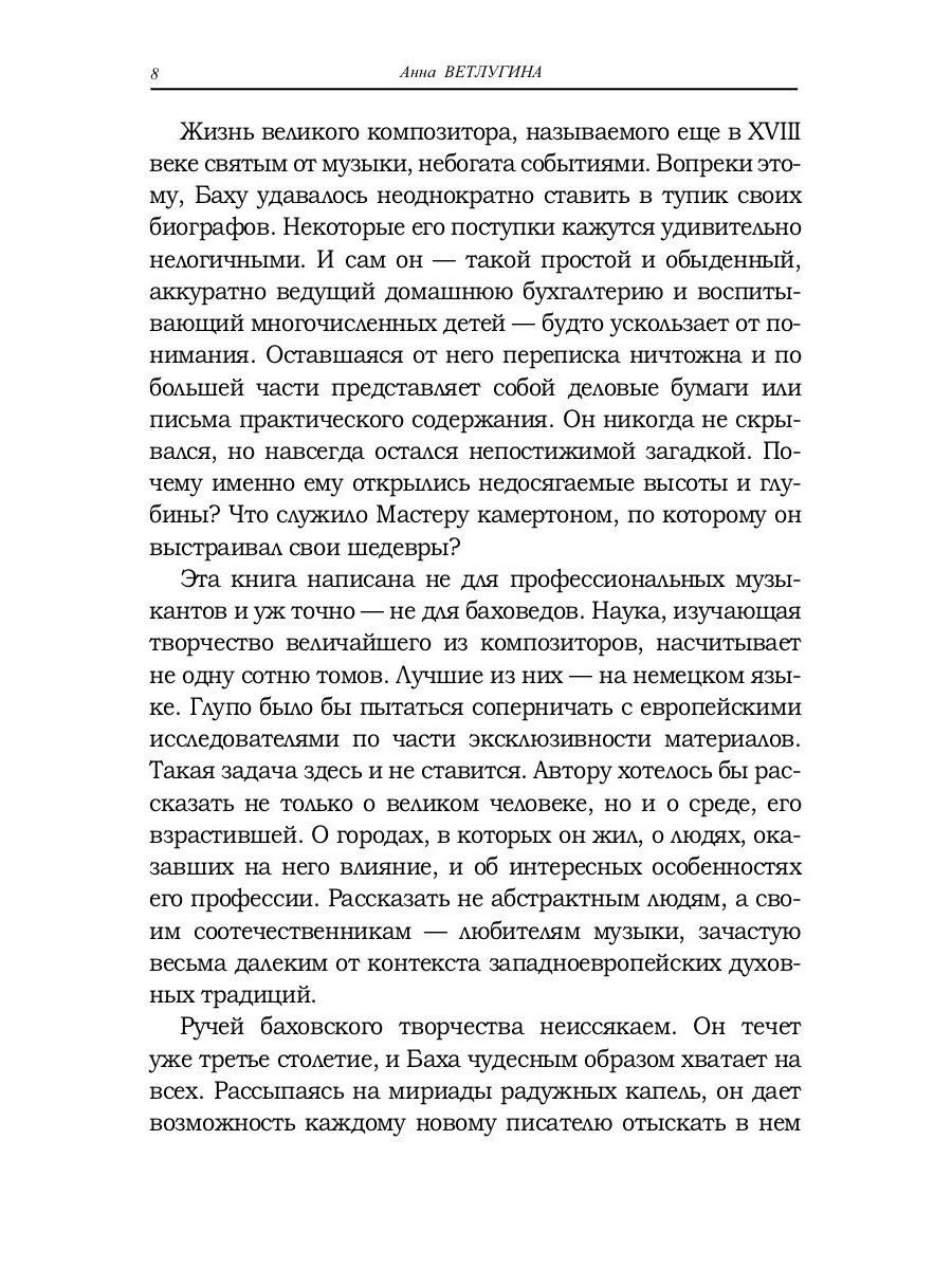 Жизнь великого композитора, называемого еще в XVIII веке святым от музыки, небогата событиями. Вопреки этому, Баху удавалось неоднократно ставить в тупик своих биографов. Некоторые его поступки кажутся удивительно нелогичными. И сам он - такой простой и обыденный, аккуратно ведущий домашнюю бухгалтерию и воспитывающий многочисленных детей - будто ускользает от понимания. Почему именно ему открылись недосягаемые высоты и глубины? Что служило Мастеру камертоном, по которому он выстраивал свои шедевры? Эта книга написана не для профессиональных музыкантов и уж точно - не для баховедов. Наука, изучающая творчество величайшего из композиторов, насчитывает не одну сотню томов. Лучшие из них - на немецком языке. Глупо было бы пытаться соперничать с европейскими исследователями по части эксклюзивности материалов. Такая задача здесь и не ставится. Автору хотелось бы рассказать не только о великом человеке, но и о среде, его взрастившей. О городах, в которых он жил, о людях, оказавших на него влияние, и об интересных особенностях его профессии. Рассказать не абстрактным людям, а своим соотечественникам - любителям музыки, зачастую весьма далеким от контекста западноевропейских духовных традиций.| Издательство | Т8 RUGRAM |