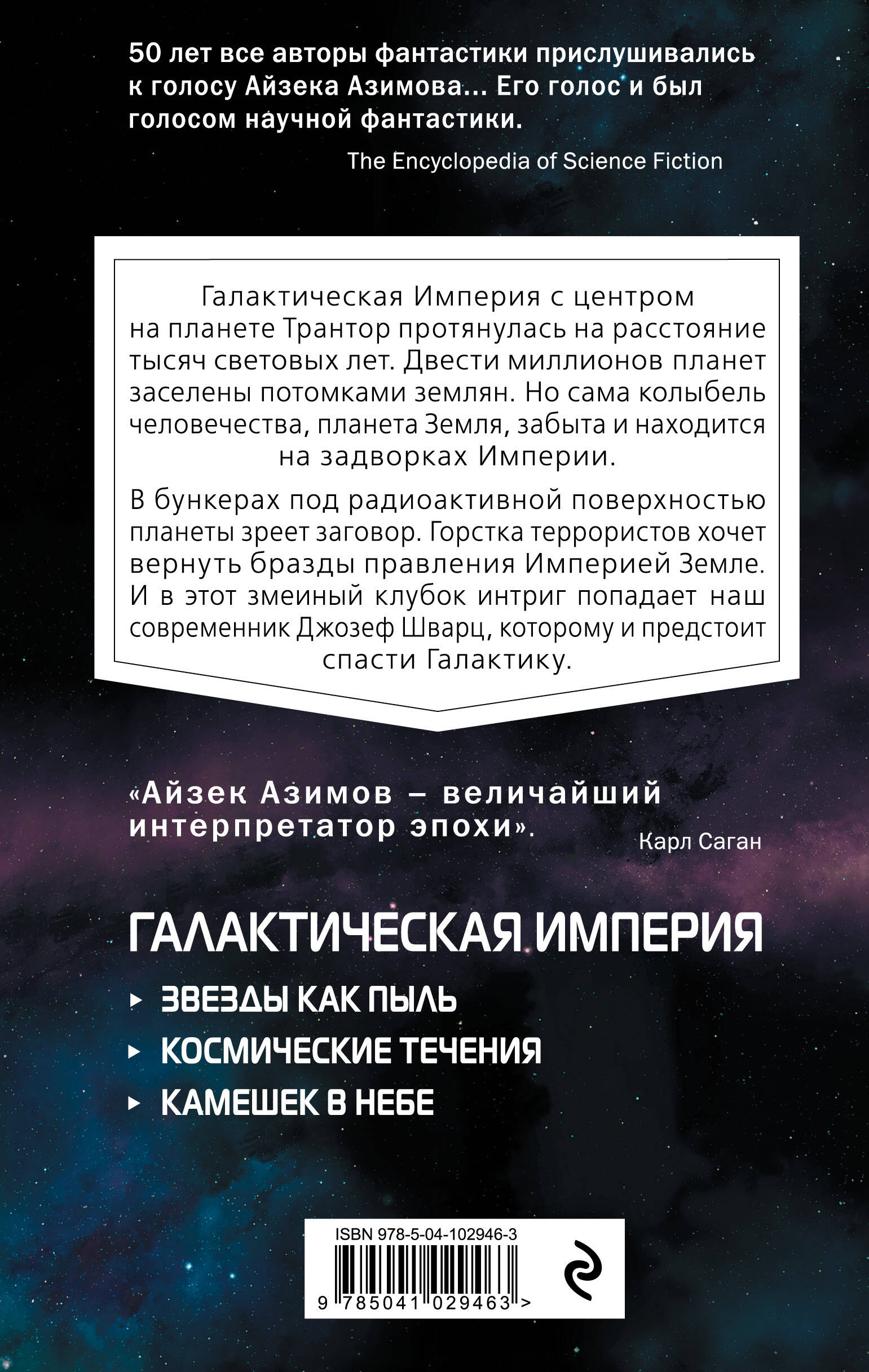 Из 1949 года Джозеф Шварц попадает в мир далёкого будущего - периода расцвета Галактической Империи. В результате древних термоядерных войн поверхность Земли стала радиоактивной и непригодной для жизни. В то же время люди расселились по всей Галактике и забыли о своей колыбели. Земля всего лишь камешек в небе. Ныне всё человечество живёт под управлением планеты Трантор, контролирующей двести миллионов звезд. Но на Земле ещё живы националистические настроения, некоторые земляне хотят вернуть себе власть предков. Одна из реваншистских группировок готовит оружие, способное опустошить всю Галактику. Шварц по велению судьбы оказывается в самом центре заговора... 1. Последний роман трилогии «Галактическая Империя», служащей прологом к легендарному циклу «Академия». 2. Айзек Азимов - один из величайших научных фантастов. 3. Образ Галактической Империи повлиял на всю последующую фантастику, даже на «Звездные Войны». 4. Великолепный образец фантастики «золотого века»! 5. Перевод романа выполнен культовыми фантастами Г.Л. Олди!| Издательство | ООО "Издательство "Эксмо" |