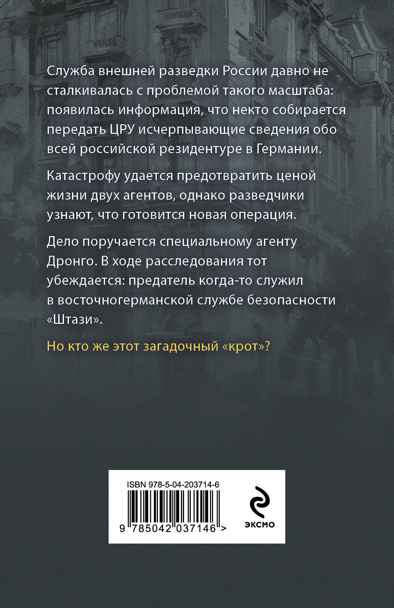Служба внешней разведки России давно не сталкивалась с проблемой такого масштаба: появилась информация, что некто собирается передать в ЦРУ исчерпывающие сведения обо всей российской резидентуре в Германии. Катастрофу удается предотвратить ценой жизни двух агентов, однако разведчики узнают, что готовится новая операция. Дело поручается специальному агенту Дронго. В ходе расследования тот убеждается: предатель когда-то служил в восточногерманской службе безопасности «Штази». Но кто же этот загадочный «крот»?| Издательство | ООО "Издательство "Эксмо" |