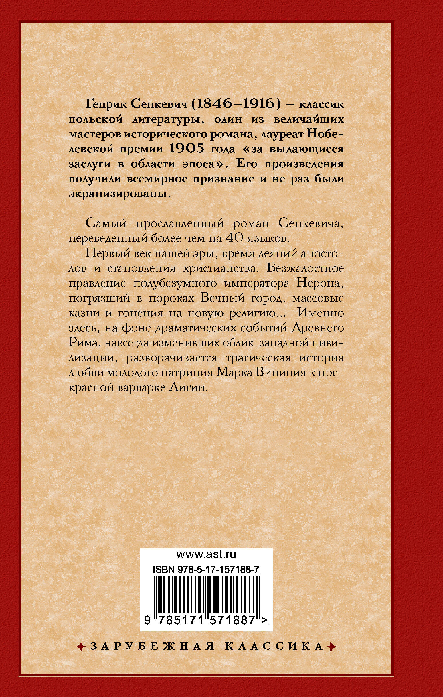 Самый прославленный роман Сенкевича, переведенный более чем на 40 языков. Первый век нашей эры, время деяний апостолов и становления христианства. Безжалостное правление полубезумного императора Нерона, погрязший в пороках Вечный город, массовые казни и гонения на новую религию… Именно здесь, на фоне драматических событий Древнего Рима, навсегда изменивших облик западной цивилизации, разворачивается трагическая история любви молодого патриция Марка Виниция к прекрасной варварке Лигии.| Издательство | ИЗДАТЕЛЬСТВО "АСТ" |