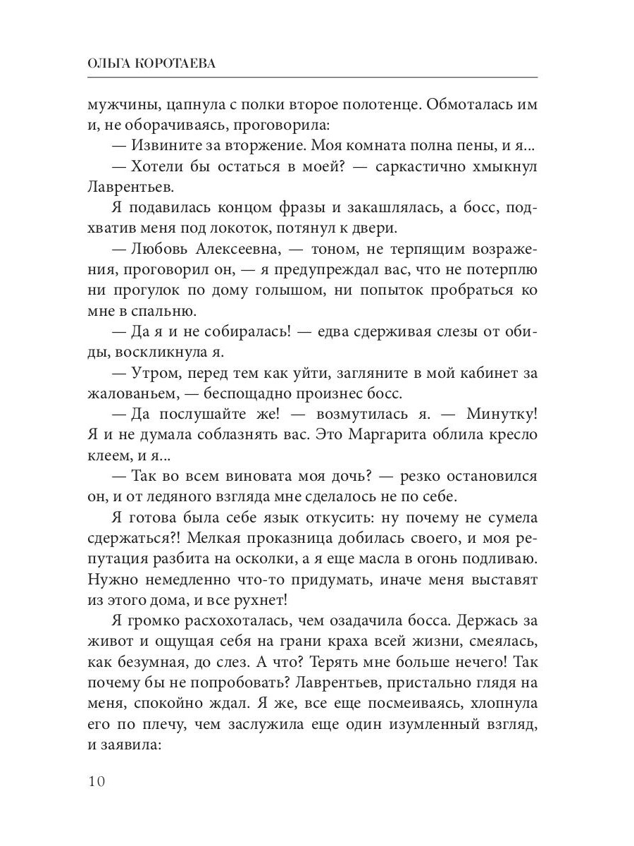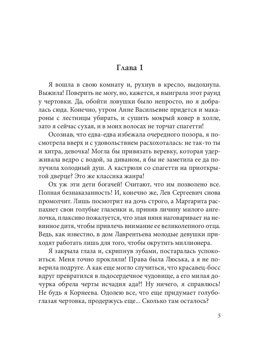 Перед защитой сгорела дипломная работа вместе с комнатой в общежитии. Пришлось согласиться на предложение ректора подменить няню для дочери его друга. Но стоило дверям богатого дома захлопнуться за моей спиной, как милое создание превратилось в чертёнка, а отец девочки в настоящего дьявола! Но самое ужасное, что мой первый босс, кажется, стал моей первой любовью. И кто кого будет воспитывать этот долгий месяц?| Издательство | Т8 RUGRAM |