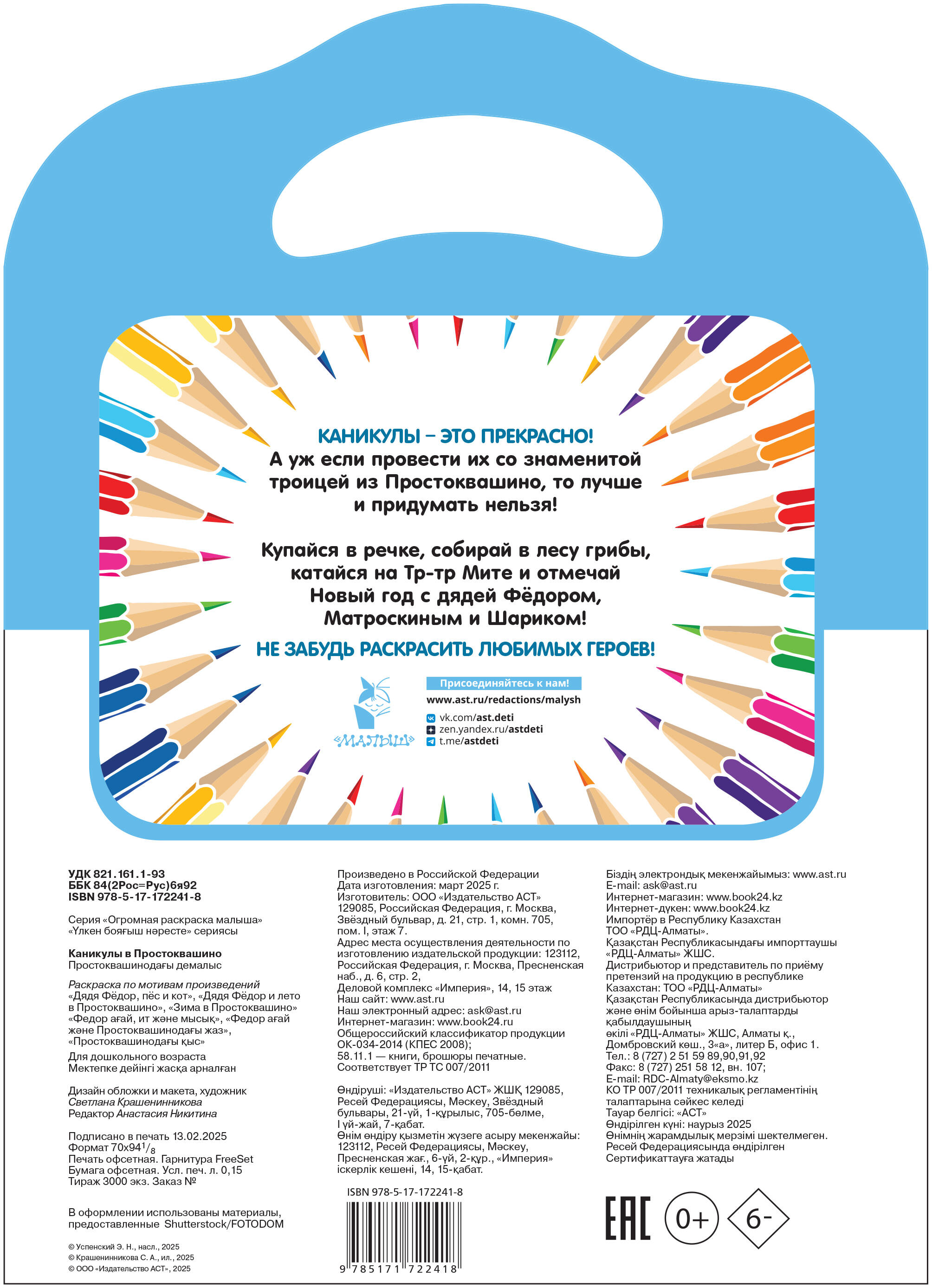 КАНИКУЛЫ - ЭТО ПРЕКРАСНО! А уж если провести их со знаменитой троицей из Простоквашино, то лучше и придумать нельзя! Купайся в речке, собирай в лесу грибы, катайся на Тр-тр Мите и отмечай Новый год с дядей Фёдором, Матроскиным и Шариком! НЕ ЗАБУДЬ РАСКРАСИТЬ ЛЮБИМЫХ ГЕРОЕВ!| Издательство | Издательство "АСТ" |
