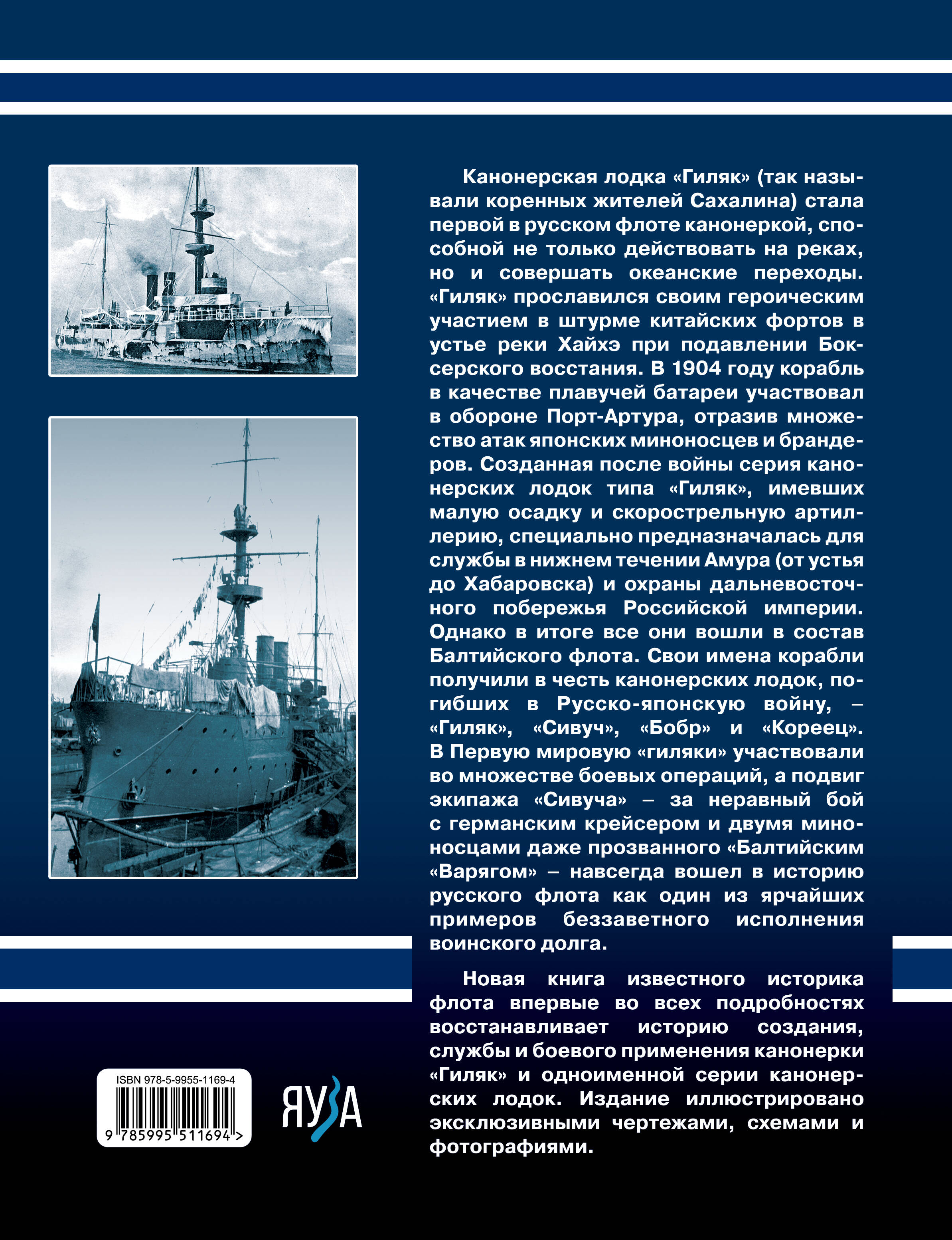 «Гиляк» (так русские поселенцы назвали коренных жителей Сахалина) стал первой в русском флоте канонерской лодкой, способной не только действовать на реках, но и совершать океанские переходы. Эта канонерка прославилась своим героическим участием в штурме китайских фортов Таку в 1900 году в устье реки Хайхэ в ходе подавления восстания ихэтуаней. В 1904 году корабль участвовал в качестве плавучей батареи в обороне Порт-Артура, отразив множество атак японских миноносцев и брандеров. Созданная после войны серия канонерских лодок типа «Гиляк», имевших малую осадку и скорострельную артиллерию, специально предназначалась для службы в нижнем течении Амура (от устья до Хабаровска) и охраны дальневосточного побережья Российской Империи. Свои имена они получили в память канонерских лодок, погибших в Русско-японскою - «Гиляк», «Сивуч», «Бобр» и «Кореец». Однако в итоге все они вошли в состав Балтийского флота. В Первую мировую «Гиляки» участвовали в боевых операциях, а подвиг экипажа «Сивуча» за неравный бой с германскими линкорами «Позен» и «Нассау» прозванного «Балтийским Варягом», подобно подвигу легендарного крейсера вошел в историю русского флота как один из ярчайших примеров мужества и беззаветного исполнения воинского долга. Новая книга известного историка флота впервые во всех подробностях восстанавливает историю создания, службы и боевого применения канонерки «Гиляк» и одноименной серии канонерских лодок. Издание иллюстрировано множеством эксклюзивных чертежей и фотографий.| Издательство | Яуза-пресс ООО |