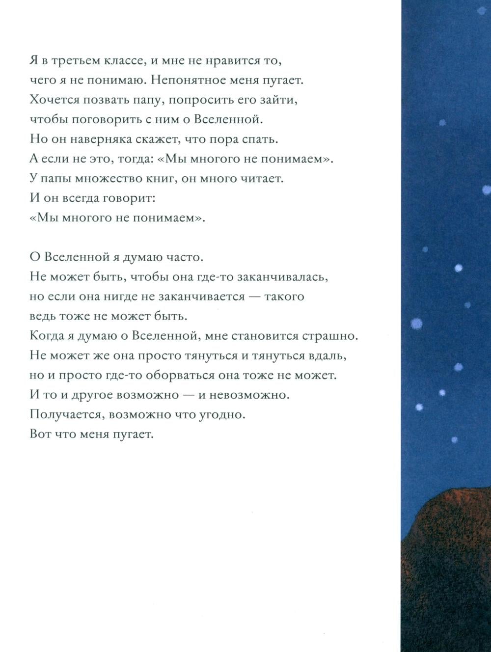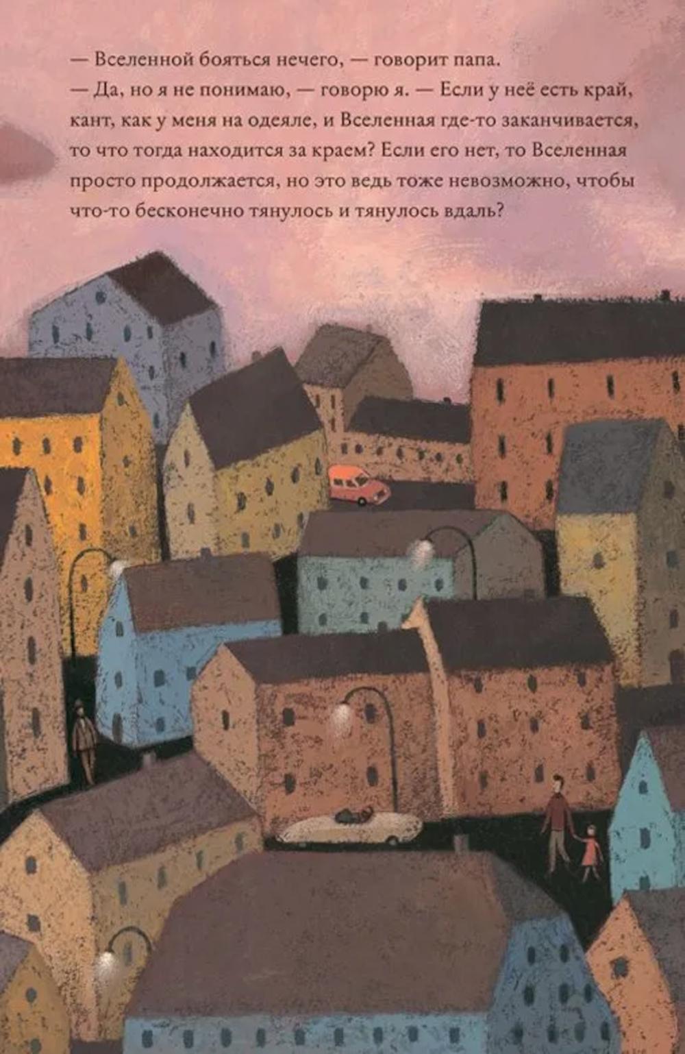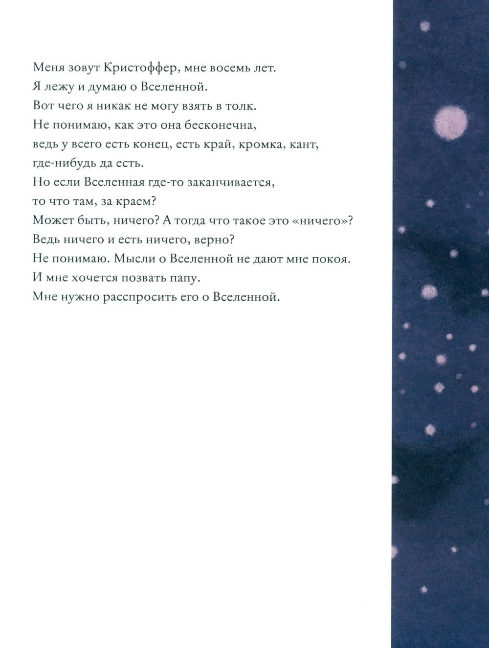 Восьмилетний Кристоффер не может уснуть, он думает о Вселенной. Её необъятность пугает и порождает множество вопросов. Бесконечна ли Вселенная? А если конечна, то есть ли у неё край, кант, как у одеяла? И что там, за краем? Вдруг во Вселенной живёт огромная великанша, и мы ей снимся? Что будет с нами, если она проснётся? Придётся позвать папу, ведь он прочитал столько книг и наверняка поможет ответить на все эти вопросы. Разговор между отцом и сыном открытый и уважительный, и мальчик обнаруживает, что понять всё невозможно, это не под силу ни Кристофферу, ни его папе, ни самому философу Канту. Но задавать вопросы и размышлять - необходимо и вовсе не так уж страшно. Главное - Кристоффер, папа и мама вместе. Даже во сне великанши. Лауреат Нобелевской премии по литературе Юн Фоссе (р. 1959) - поэт, прозаик, драматург, эссеист, переводчик и автор детских книг. Произведения Фоссе переведены на более чем пятьдесят языков, а по количеству поставленных по всему миру пьес он может сравниться лишь с классиком норвежской литературы Хенриком Ибсеном. Темы его творчества универсальны, а литературный стиль уникален и узнаваем.| Издательство | Городец |