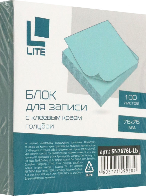 Блок самоклеящийся, 76х76 мм, 100 листов, голубой