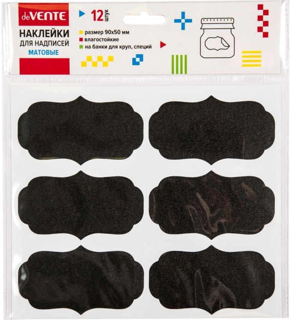 Наклейки для надписей "deVENTE" 90x50 мм, влагостойкие, черные, матовые, фигурные, для мелков и маркеров, 12 шт, ПВХ 100 мкм, на банки для круп, специй, индивидуальная упаковка