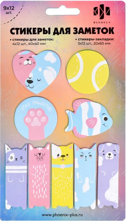 Стикеры для заметок бумажные, 40х40; 20х60 мм, 108 шт. (материал: бумага 80 г/м?, цвет: голубой, жёлтый, сиреневый; кол-во листов: 108 л., форма: фигурная, декор: полноцветная печать, фигурная вырубка; наличие диспенсера: нет, индивидуальная упаковка: подложка с европодвесом из голографического картона + ПЭТ-пакет)