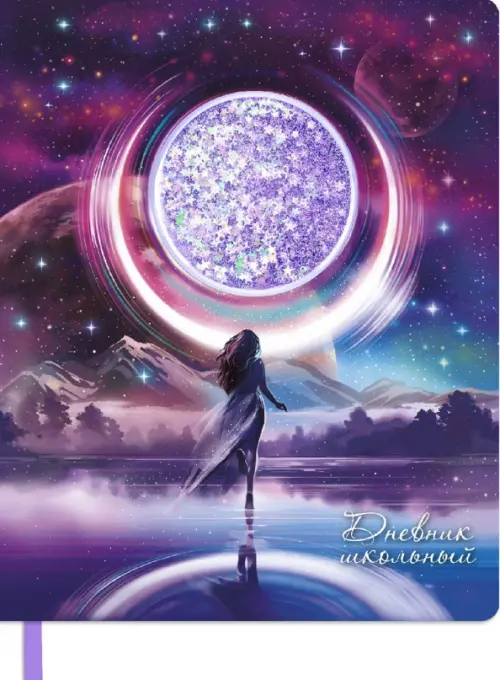 Дневник школьный, ДЕВУШКА И ЛУНА формат А5+, 48 л., твёрдый переплёт с поролоном. Обложка: искусственная кожа "Сариф", аппликация в виде прозрачного пластикового окна с маслом, пайетками и глиттером внутри, полноцветная печать, углы обложки закруглённые, углы блока закруглённые, отделка среза: окрашивание пантоном, одно ляссе, красочность форзаца: печать в одну краску, красочность блока: печать в одну краску. Блок: бумага - белый офсет, 80 г/м?, универсальная шпаргалка. Индивидуальная упаковка: ПЭТ-пакет.