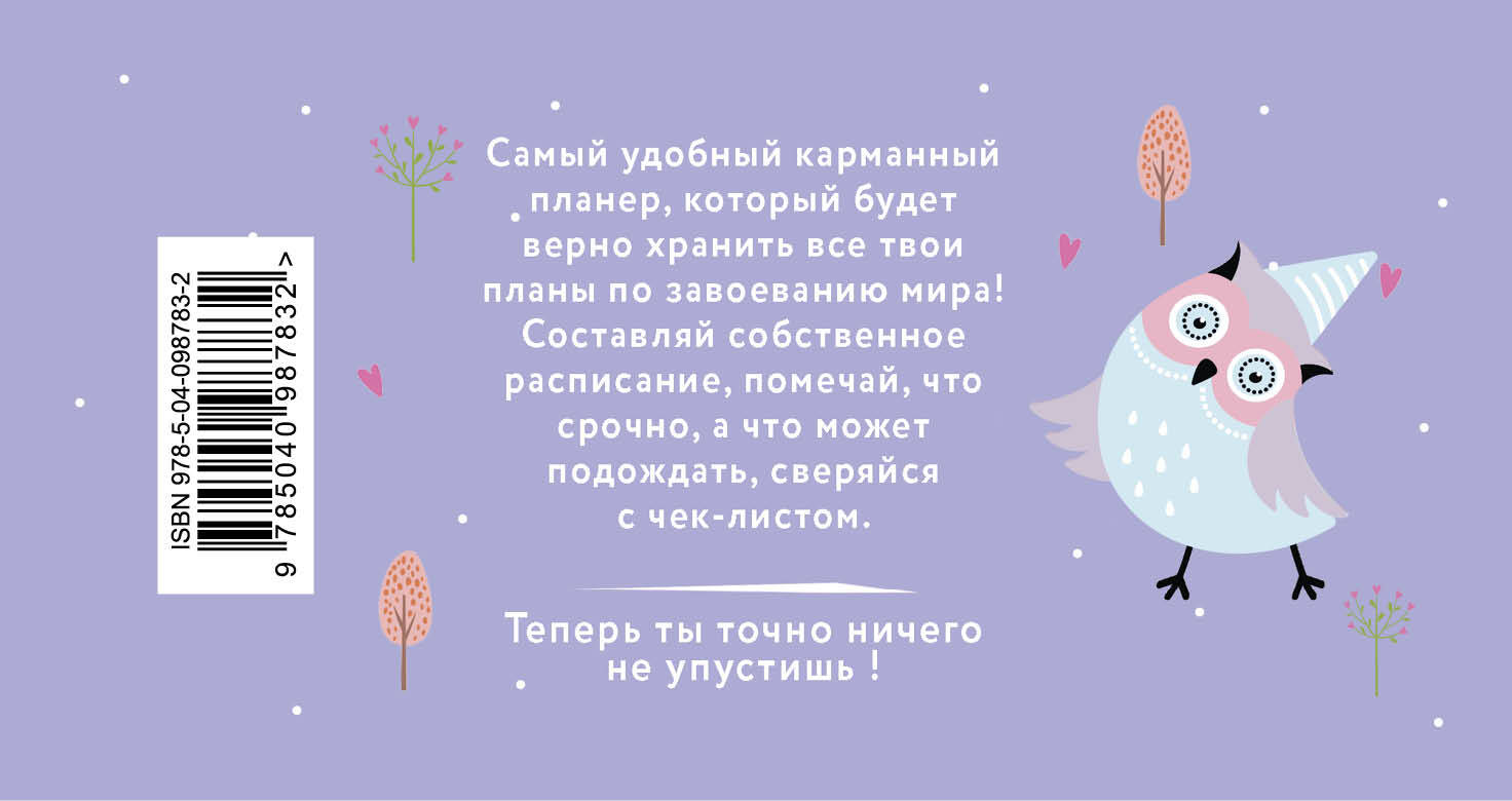 Как все успевать и ничего не забыть? Как организовать свои дела, планы и встречи, расставить все полочкам, чтобы достичь самых главных целей? Разработай свою стратегию жизни с помощью лимитированной коллекции стильных планеров! Составляй свое собственное расписание, помечай, что срочно, а что может подождать, что нужно обязательно запомнить, а о чем лучше вообще забыть. 96 страниц на пружине для записи всех предстоящих событий, места для комментариев, удобный формат позволяет всегда твоему планеру быть с тобой и не позволит упустить ничего важного из виду.| Издательство | ООО "Издательство "Эксмо" |