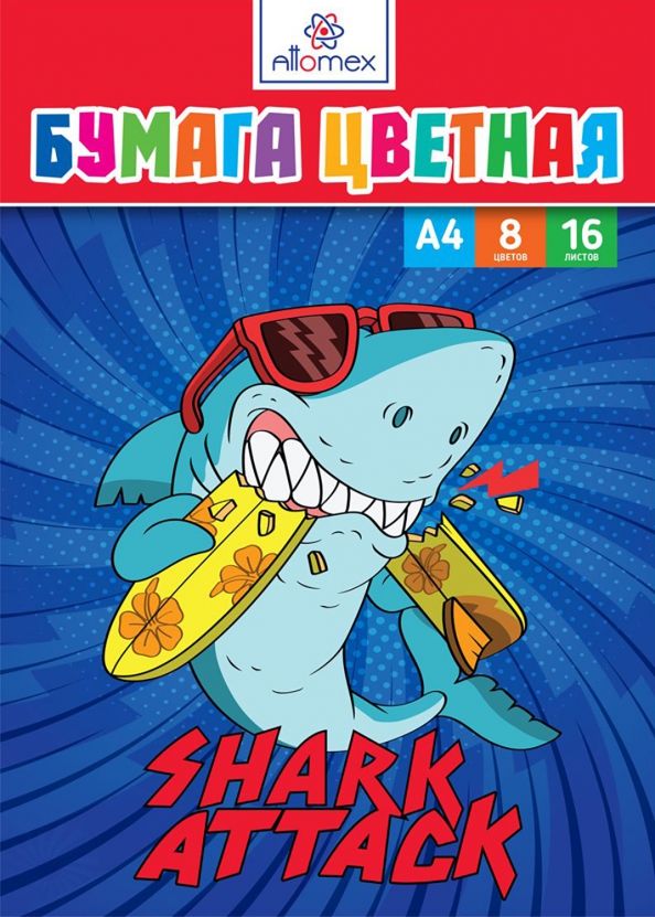 Бумага цветная газетная двусторонняя "Attomex. Акула" A4 (200x280 мм) 50 г/м?, A4, 8 цв, 16 л, обложка мелованная 80 г/м?, на скобе