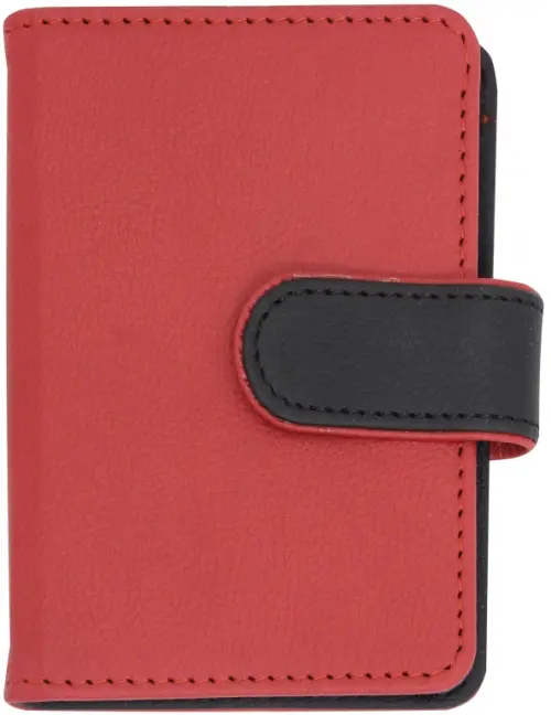 Визитница односторонняя.<br /> 16 внутренних карманов.<br /> Закрывается на клапан с кнопкой.<br /> Размер: 80х110 мм.<br /> Цвет: красно-черный.<br /> Материал: искусственная кожа.<br /> Сделано в Китае.