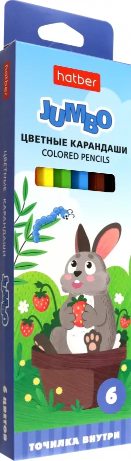 Карандаши цветные 6 цветов Hatber Jumbo с утолщенным шестигранным корпусом и насыщенной цветовой гаммой. Прочный неломкий грифель толщиной 4мм имеет превосходную мягкость, оставляет плотный выразительный след на поверхности бумаги. Набор поставляется в картонной упаковке с вырубным окошком и европодвесом. Карандаши внутри коробки уложены в удобный пластиковый поддон, в котором также находится пластиковая точилка, подходящая по размеру для затачивания утолщенного корпуса.