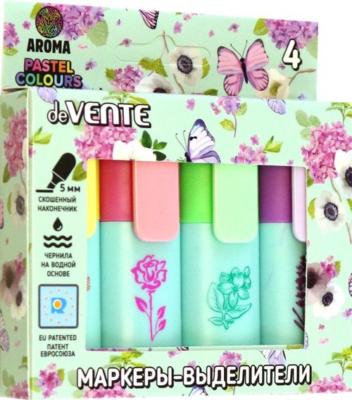 Набор маркеров-выделителей "deVENTE. Flowers" (04 цв - пастельные цвета: роз, желт, зелен, фиол) плоский мини-корпус, скошенный наконечник, ширина линии 1-5 мм, ароматизированные чернила, в картонной коробке