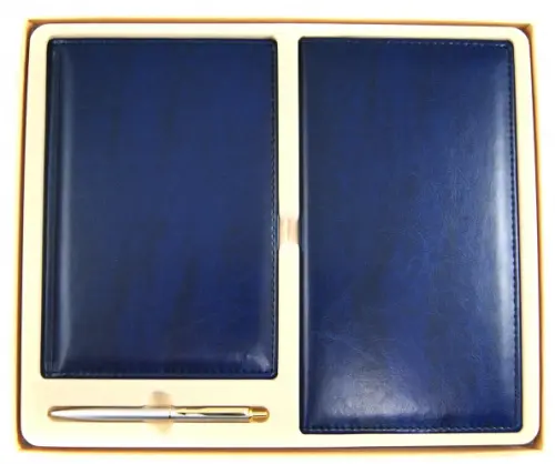 Деловые аксессуары набора выполнены в классическом дизайне и являются достойными спутниками делового человека. Мягкая обложка из материала под натуральную кожу придаст солидность обладателю. Набор послужит отличным подарком к знаменательному событию.<br /> Набор из 3 деловых аксессуаров. <br /> Обложка предметов набора - "натуральная кожа". <br /> Цвет - темно-синий. <br /> Ежедневник - формат А5 (148х218 мм), недатированный. Внутренний блок - белая бумага.<br /> Визитница четырехрядная, на кольцах (140х253 мм), на 240 визиток. <br /> Автоматическая шариковая ручка. <br /> Цвет чернил: синий.<br /> Подарочная коробка из плотного картона, покрытая дизайнерской бумагой. <br /> Внутри подарочной коробки - флокированный ложемент.