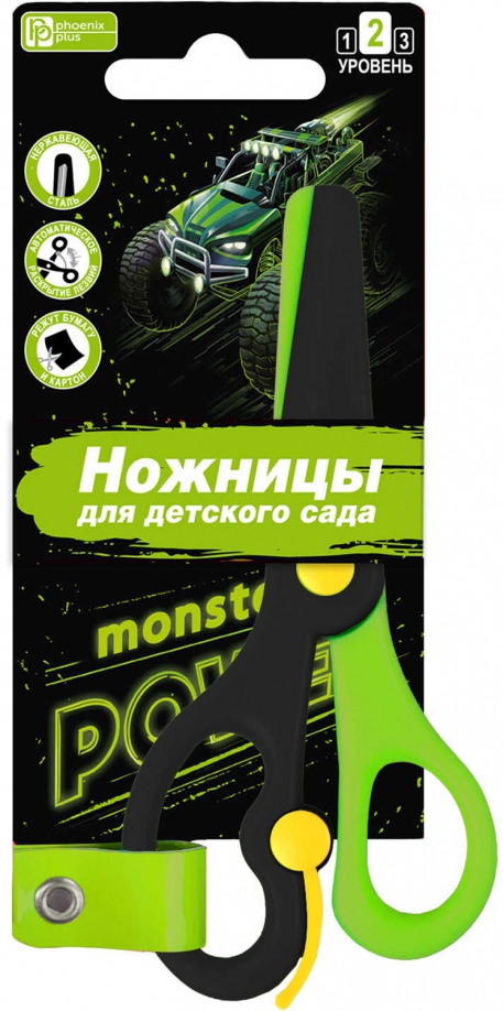 Ножницы для детей Феникс+, арт.66050/ 24 МОНСТР-ТРАК (зеленый, чёрный, 13,5х6,2 см, длина лезвия: 4,8 см, нержавеющая сталь, асимметричные, для бумаги, картона, с возвратным механизмом, картонная подложка с европодвесом)