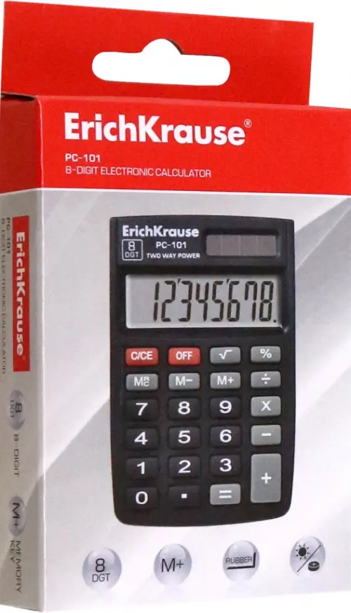 Карманный калькулятор в пластиковом корпусе с 8-разрядным ЖК - дисплеем. Имеет одноуровневую память. Оптимальный набор вычислительных функций позволяет совершать основные математические операции, рассчитывать проценты, извлекать квадратный корень и запоминать промежуточный результат. Для экономии энергии предусмотрены два источника питания: солнечная и алкалиновая батареи, а также функция автоматического выключения. Для защиты от загрязнений, повреждений и случайного включения в комплекте предусмотрена PVC обложка.
