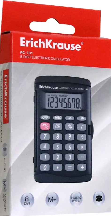 Карманный калькулятор в пластиковом корпусе с 8-разрядным ЖК - дисплеем. Имеет одноуровневую память. Оптимальный набор вычислительных функций позволяет совершать основные математические операции, рассчитывать проценты, извлекать квадратный корень и запоминать промежуточный результат. Источник питания - алкалиновая батарея. Для экономии энергии предусмотрена функция автоматического выключения. Для защиты от загрязнений, повреждений и случайного включения предусмотрена полупрозрачная пластиковая крышка.