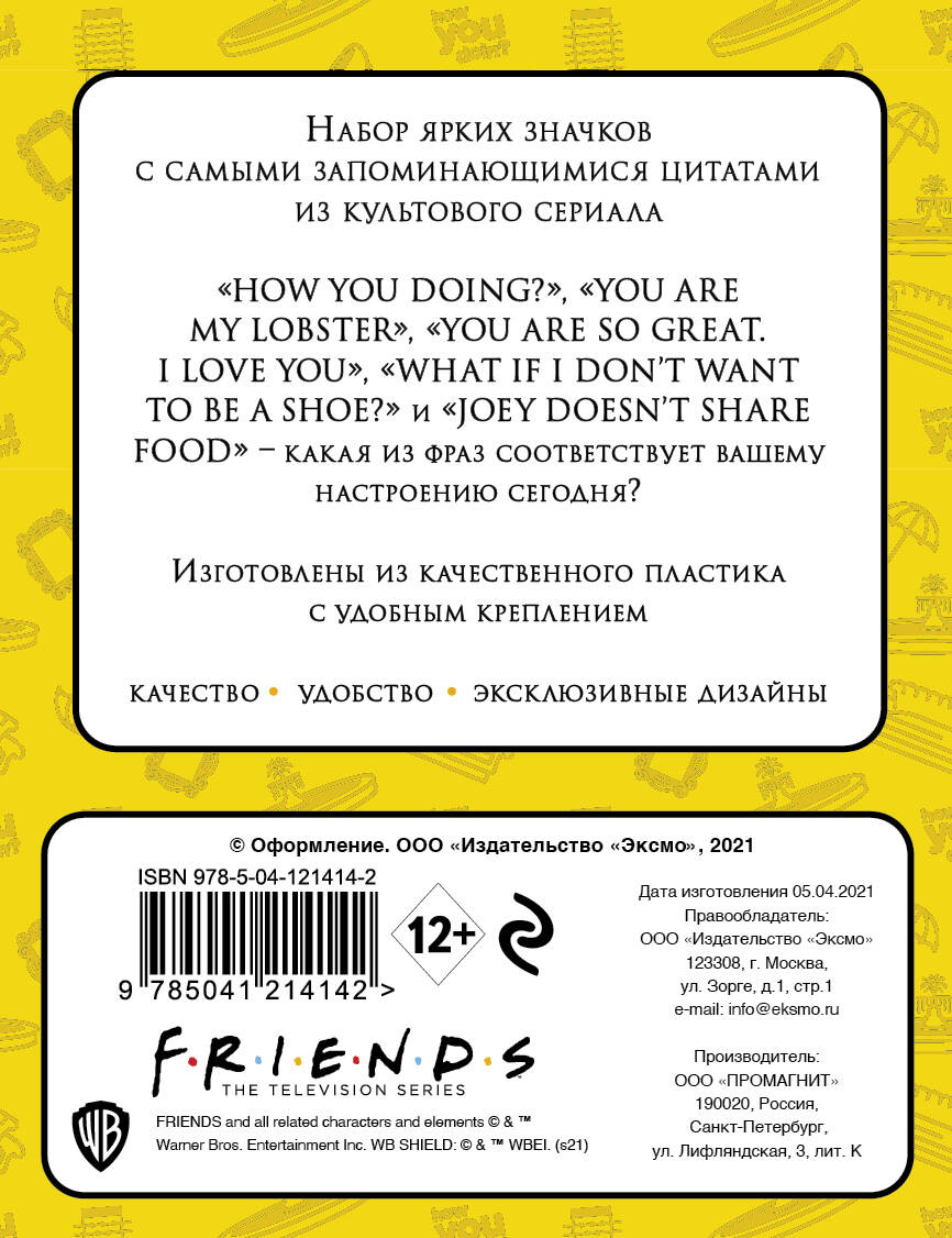 Серия «Вселенная Друзей» - это эксклюзивные официальные издания по уютной вселенной сериала «Друзья»! Блокноты, скетчбуки, закладки, значки, календари и многое другое созданы для настоящих фанатов культового сериала! Для кого: - Для тех, кто начинает разговор с фразы «Каааак дела?». - Для тех, кто готов в любой момент подпевать песне про драного кота. - Для тех, кто любит шутки Чендлера и тоже шутит, когда ему неловко. - Для тех, кто хочет стать обладателем эксклюзивного набора значков. Фишки набора значков: - Эксклюзивные яркие дизайны. - Диаметр каждого значка 38 мм. - Самые культовые фразы из сериала. - Удобно упакован в пакет с европодвесом.| Издательство | Эксмо |