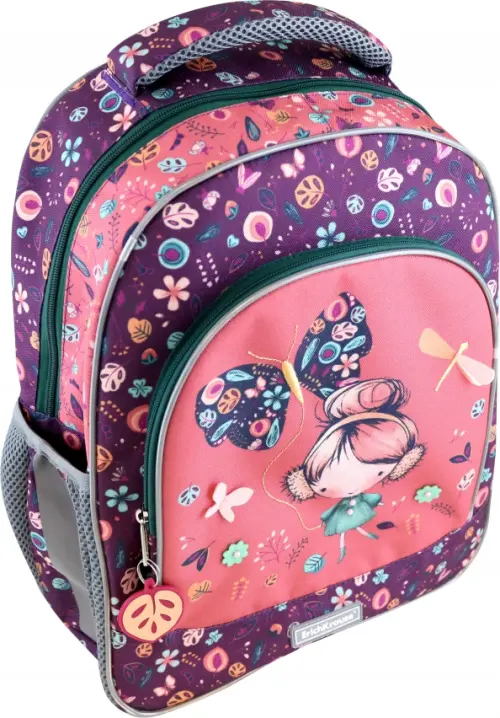 Этот рюкзак размера 39х28х14 см объёмом 15 л изготовлен из полиэстера 600D с полиуретановой пропиткой, что делает его устойчивым к износу и морозу. Внутри вместительное отделение с эластичным фиксатором для тетрадей и учебников формата А4+. Также есть мини-органайзер для мелкой канцелярии и карман на молнии. На дне - жёсткая откидная вставка. Снаружи фронтальный карман на молнии с плавным ходом, а также два боковых на резинке, куда можно положить бутылку с водой или зонтик. Рюкзак весит всего 520 г, что делает его одним из самых лёгких в своей категории. У модели эргономичная спинка ErgoLine® System. Такая конструкция из мягких подушечек равномерно распределяет вес рюкзака и снижает нагрузку на позвоночник. Ткань спинки AirMesh "дышит", а воздушные каналы между ее подушечками препятствуют образованию влаги. Мягкие S-образные лямки не давят на плечи ребёнка. Светоотражающие элементы по всему периметру повышают безопасность в темноте. Модель также оснащена объёмной и удобной ручкой для переноски в руке. Крепления ручки и лямок усилены дополнительными швами из лавсановых нитей. Пластиковые ножки защищают от загрязнений и влаги. Рюкзак ErichKrause ErgoLine® - оптимальный выбор для занятий в школе.