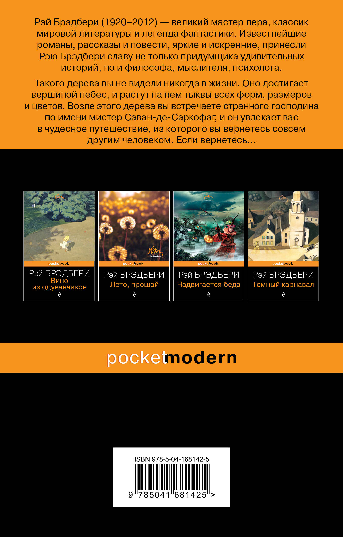 Рэй Брэдбери (1920-2012) - великий мастер пера, классик мировой литературы и живая легенда фантастики. Его книги уже более полувека увлеченно читают миллионы людей во всем мире. Брэдбери намного больше, чем писатель-фантаст, - его творчество можно отнести к «высокой», внежанровой литературе. Известнейшие романы, рассказы и повести, яркие и искренние, принесли Рэю Брэдбери славу не только придумщика удивительных историй, но и философа, мыслителя, психолога. Такого дерева вы не видели никогда в жизни. Оно достигает вершиной небес, и растут на нем тыквы всех форм, размеров и цветов. Возле этого дерева вы встречаете странного господина по имени мистер Смерч, и он увлекает вас в чудесное путешествие, из которого вы вернетесь совсем другим человеком - если вернетесь...| Издательство | ООО "Издательство "Эксмо" |