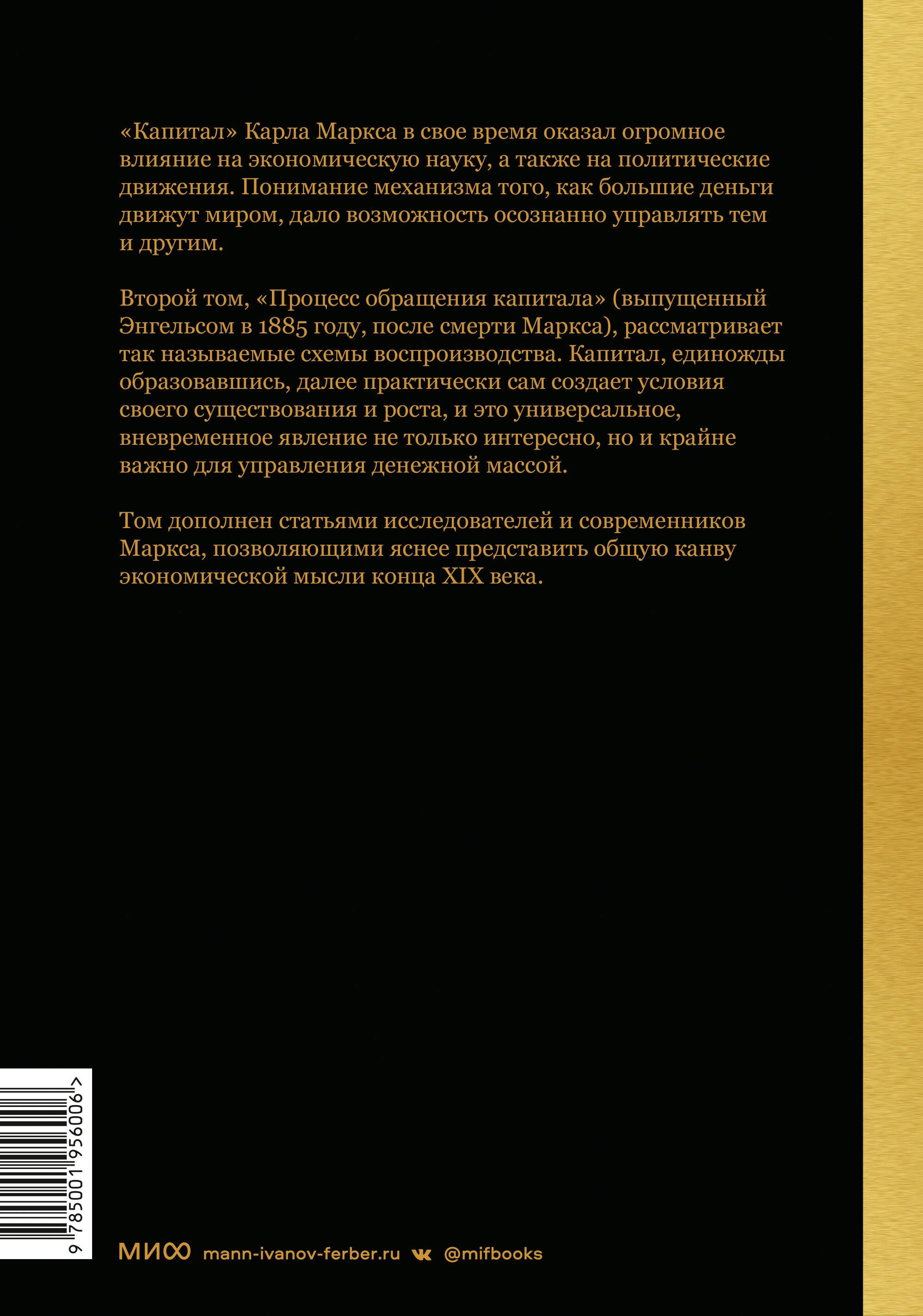 Капитал" Карла Маркса - поистине великая книга. Он переведен на более чем 50 языков и переиздавался более 220 раз. В свое время этот труд перевернул не только экономическую науку, но и - опосредованно - весь мировой порядок, потому что был вскрыт механизм того, как деньги, собираясь в капитал, подчиняют себе человеческое общество. С тех пор интерес к "Капиталу" не утихает. Поразительно, но в XIX веке были предсказаны реалии наших дней: глубокие рецессии, формирование мнимых потребностей, глобализация, автоматизация производств с закономерной безработицей. И если вы хотите разобраться в том, как абстрактный капитал управляет реальной жизнью, то стоит прочесть труд Маркса в полной версии. Второй том, "Процесс обращения капитала" (выпущенный Энгельсом в 1885 году, после смерти Маркса), рассматривает так называемые схемы воспроизводства. Капитал, единожды образовавшись, далее практически сам создает условия своего существования и роста, и это универсальное, вневременное явление не только интересно, но и крайне важно для управления денежной массой. Том дополнен статьями исследователей и современников Маркса, позволяющими яснее представить общую канву экономической мысли конца XIX века. Для кого эта книга: Для любителей классических изданий по экономике и политике. Для всех, кто хочет разобраться в том, как работает капитализм.| Издательство | МАНН, ИВАНОВ И ФЕРБЕР ООО |