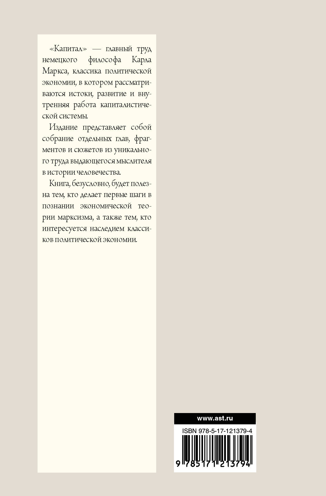 "Капитал" - главный труд немецкого философа Карла Маркса, классика политической экономии, в котором рассматриваются истоки, развитие и внутренняя работа капиталистической системы. Данное издание представляет собой собрание отдельных глав, фрагментов и сюжетов из уникального труда выдающегося мыслителя в истории человечества. При составлении особое внимание было уделено тем материалам, которые в конкретно-исторической обстановке современности не просто не потеряли актуальности, но еще и более актуализировались. Книга, безусловно, будет полезна тем, кто делает первые шаги в познании экономической теории марксизма, а также тем, кто интересуется наследием классиков политической экономии, и широкой читательской аудитории.| Издательство | ИЗДАТЕЛЬСТВО "АСТ" |