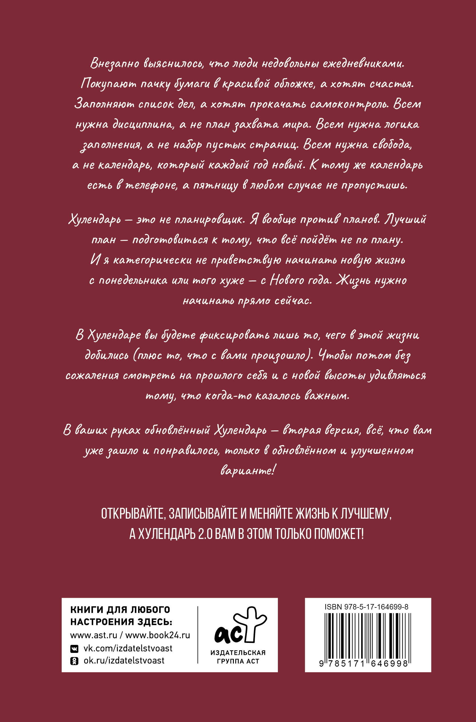 Внезапно выяснилось, что люди недовольны ежедневниками. Покупают пачку бумаги в красивой обложке, а хотят счастья. Заполняют список дел, а хотят прокачать самоконтроль. Всем нужна дисциплина, а не план захвата мира. Всем нужна логика заполнения, а не набор пустых страниц. Всем нужна свобода, а не календарь, который каждый год новый. К тому же календарь есть в телефоне, а пятницу в любом случае не пропустишь. Хулендарь - это не планировщик. Я вообще против планов. Лучший план - подготовиться к тому, что всё пойдёт не по плану. И я категорически не приветствую начинать новую жизнь с понедельника или того хуже - с Нового года. Жизнь нужно начинать прямо сейчас. В Хулендаре вы будете фиксировать лишь то, чего в этой жизни добились (плюс то, что с вами произошло). Чтобы потом без сожаления смотреть на прошлого себя и с новой высоты удивляться тому, что когда-то казалось важным. Думайте и провоцируйте себя на великие свершения!| Издательство | Издательство "АСТ" |