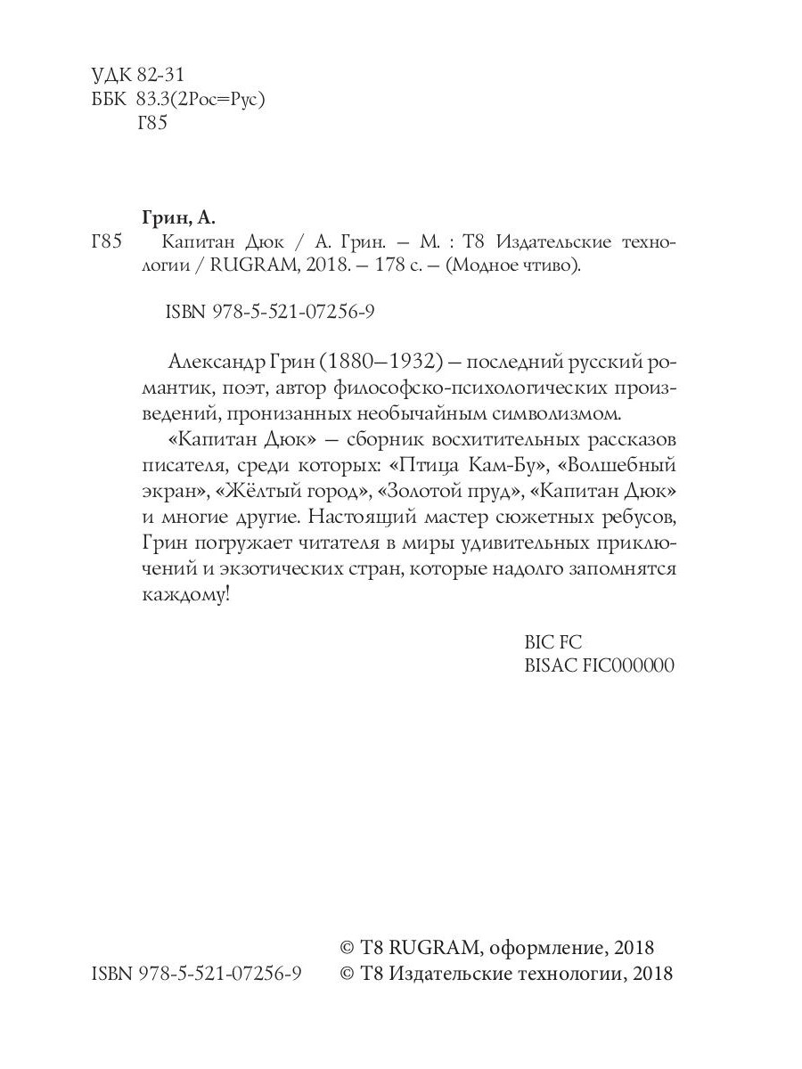 «Капитан Дюк» - сборник восхитительных рассказов писателя, среди которых: «Птица Кам-Бу», «Волшебный экран», «Жёлтый город», «Золотой пруд», «Капитан Дюк» и многие другие. Настоящий мастер сюжетных ребусов, Грин погружает читателя в миры удивительных приключений и экзотических стран, которые надолго запомнятся каждому!
