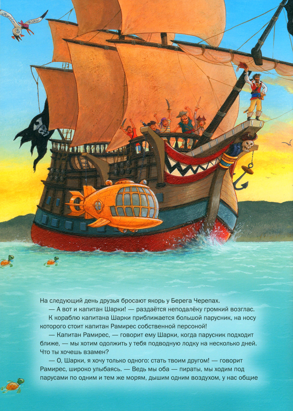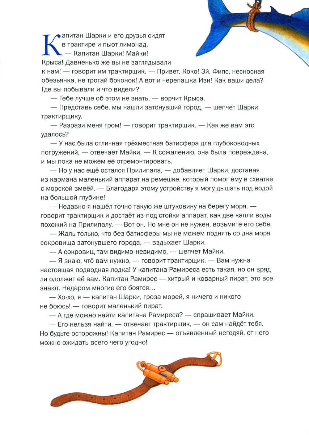 Задраить люки! Приготовиться к погружению! Глубоко на морском дне капитан Шарки и его друг Майки находят древний город, который ушёл под воду из-за извержения вулкана. В этом городе остались несметные богатства, но во время первого погружения на батисферу, в которой находятся друзья, нападает огромная морская змея, и им не удаётся поднять сокровища со дна моря*. Конечно, Шарки и Майки собираются вернуться в затонувший город, чтобы забрать эти сокровища! Они снова отправляются в подводное путешествие, на этот раз - вместе с капитаном Рамиресом, который уверяет Шарки в своей дружбе и предоставляет для путешествия свою подводную лодку. Но можно ли верить этому капитану, которого многие считают хитрым и коварным пиратом? * Об этом рассказывается в книге «Капитан Шарки и сокровища морских глубин» (М.: Добрая книга, 2021).| Издательство | Добрая книга |