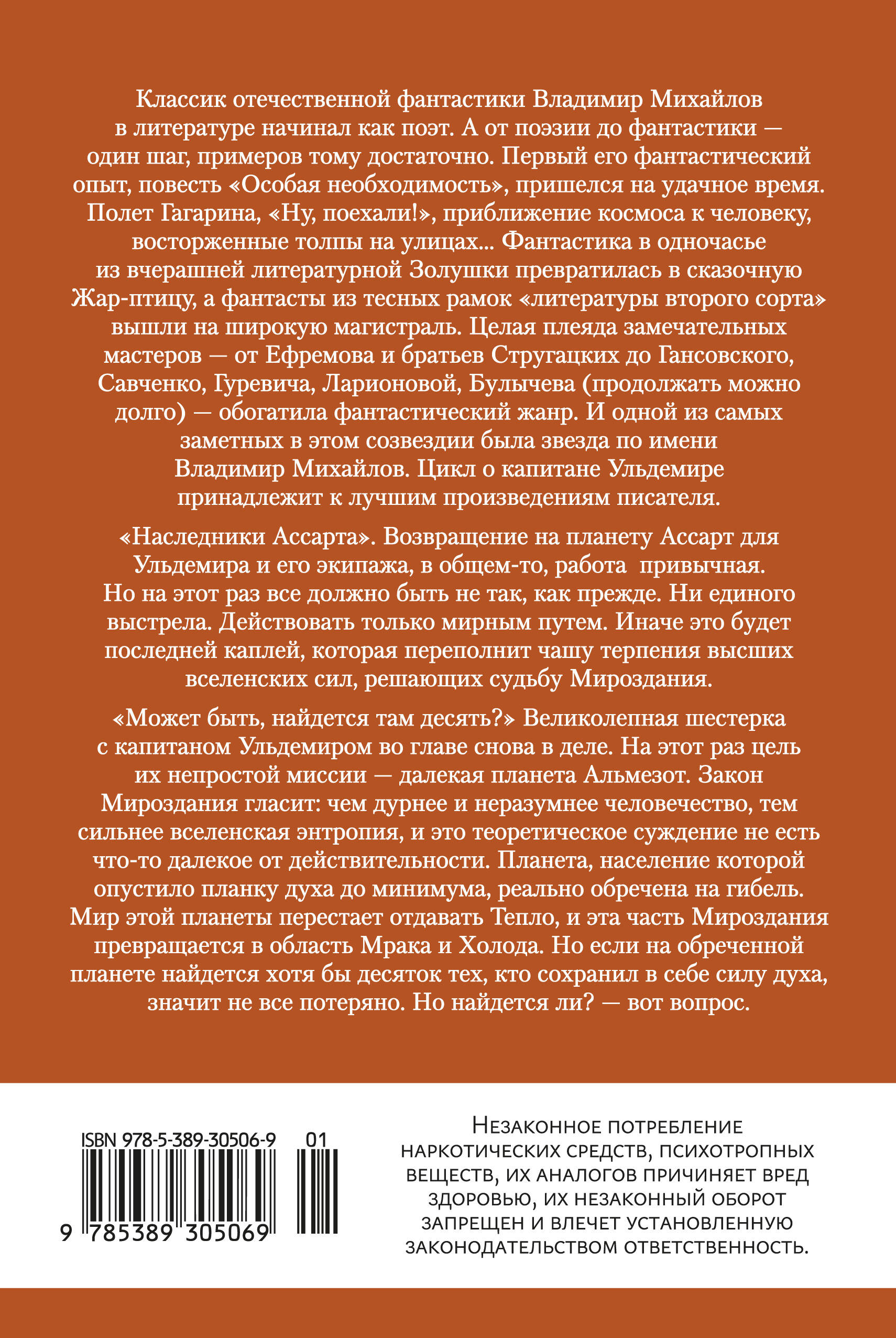 Классик отечественной фантастики Владимир Михайлов в литературе начинал как поэт. А от поэзии до фантастики - один шаг, примеров тому достаточно. Первый его фантастический опыт, повесть «Особая необходимость», пришелся на удачное время. Полет Гагарина, «Ну, поехали!», приближение космоса к человеку, восторженные толпы на улицах… Фантастика в одночасье из вчерашней литературной Золушки превратилась в сказочную Жар-птицу, а фантасты из тесных рамок «литературы второго сорта» вышли на широкую магистраль. Целая плеяда замечательных мастеров от Ефремова и братьев Стругацких до Гансовского, Савченко, Гуревича, Ларионовой, Булычева (продолжать можно долго) обогатила фантастический жанр. И одной из самых заметных в этом созвездии была звезда по имени Владимир Михайлов. Цикл о капитане Ульдемире принадлежит к лучшим произведениям писателя. «Наследники Ассарта»: возвращение на планету Ассарт для Ульдемира и его экипажа в общем-то работа привычная. Но на этот раз всё должно быть не так, как прежде. Ни единого выстрела. Действовать только мирным путем. Иначе это будет последней каплей, которая переполнит чашу терпения высших вселенских сил, решающих судьбу Мироздания. «Может быть, найдется там десять?»: Великолепная шестерка с капитаном Ульдемиром во главе снова в деле. Цель их непростой миссии - далекая планета Альмезот. Закон Мироздания гласит: чем дурнее и неразумнее человечество, тем сильнее вселенская энтропия, и это теоретическое суждение не есть что-то далекое от действительности. Планета, чье население опустило планку духа до минимума, реально обречена на гибель. Мир этой планеты перестает отдавать Тепло, и эта часть Мироздания превращается в область Мрака и Холода. Но если на обреченной планете найдется хотя бы десяток тех, кто сохранил в себе силу духа, значит не все потеряно. Но найдется ли? - вот вопрос. Книга интересна как почитателям творчества фантаста, так и всем любителям жанра. Завершает цикл из шести романов о звездном капитане Ульдемире. Ценна и как подарок, и просто как хорошая книга.| Издательство | Издательство АЗБУКА ООО |