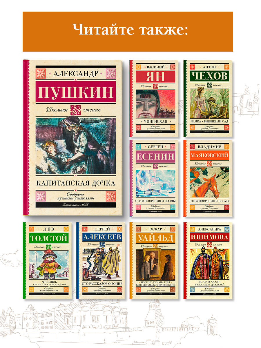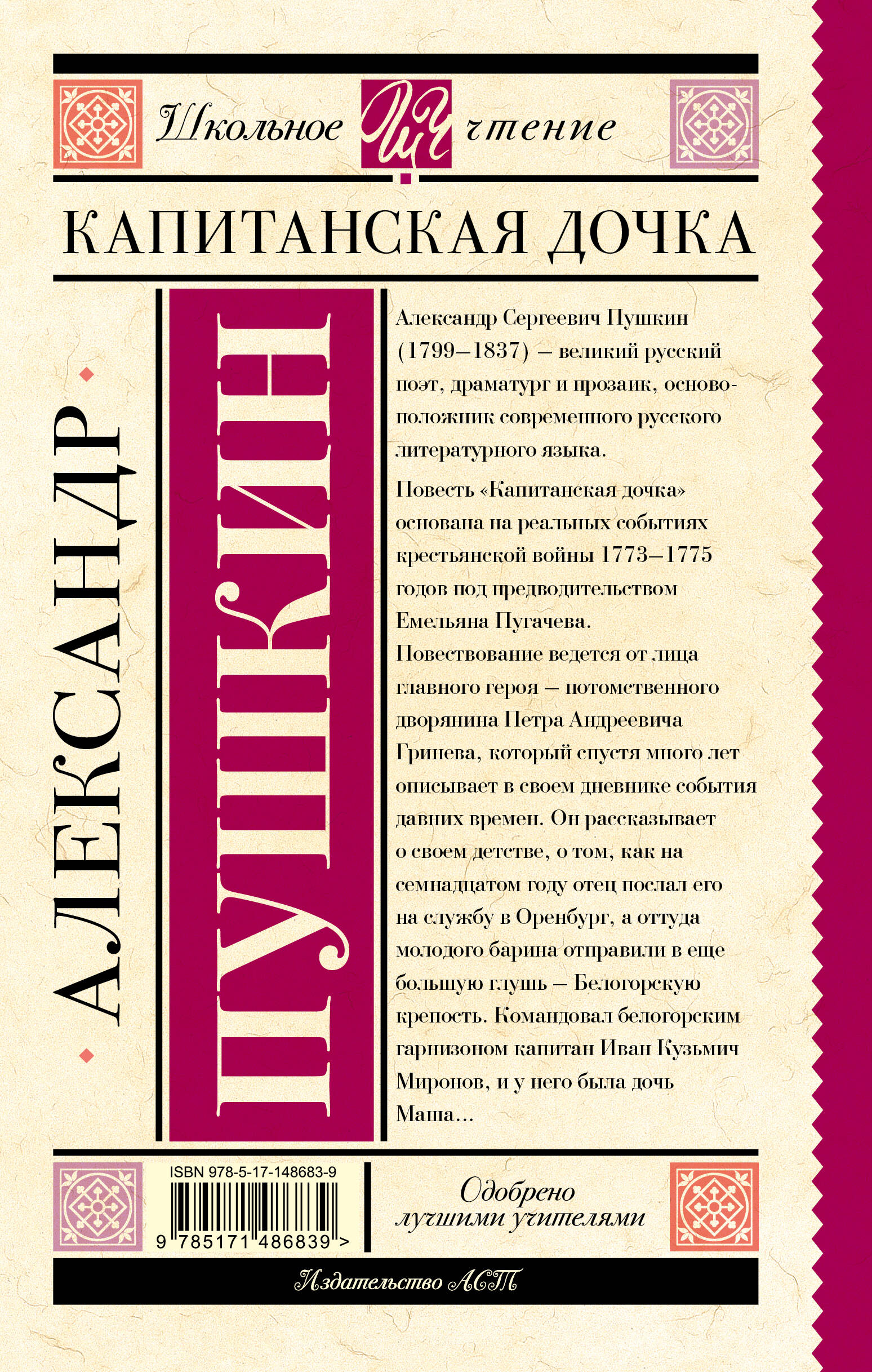 Одно из самых известных произведений Александра Сергеевича Пушкина! Повесть "Капитанская дочка" основана на реальных событиях крестьянской войны 1773-1775 годов под предводительством Емельяна Пугачева. Это история расскажет юным читателям о смелости и верности, дружбе, первой любви и истории родного края. Произведение входит в школьную программу по литературе. В серию включены лучшие произведения отечественной и зарубежной литературы, входящие в школьную программу с 1 по 11 класс и в списки дошкольного чтения. Книги в твердом переплёте сделают знакомство с литературой легким и увлекательным. Серия, которая не ударит по семейному бюджету и поможет юному читателю расти нравственно и интеллектуально!| Издательство | АСТ |
