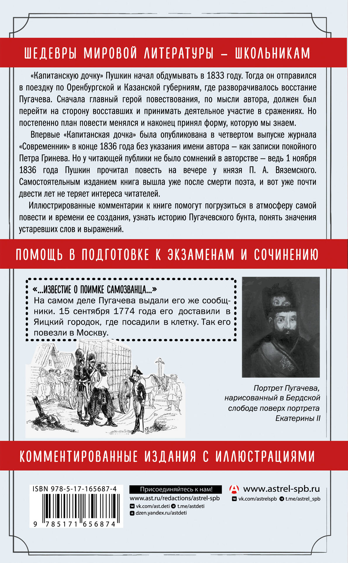 Впервые «Капитанская дочка» была опубликована в четвертом выпуске журнала «Современник» в конце 1836 года без указания имени автора - как записки покойного Петра Гринева. Но у читающей публики не было сомнений в авторстве - ведь 1 ноября 1836 года Пушкин прочитал повесть на вечере у князя П. А. Вяземского. Самостоятельным изданием книга вышла после смерти поэта, и вот уже почти двести лет не теряет интереса читателей.