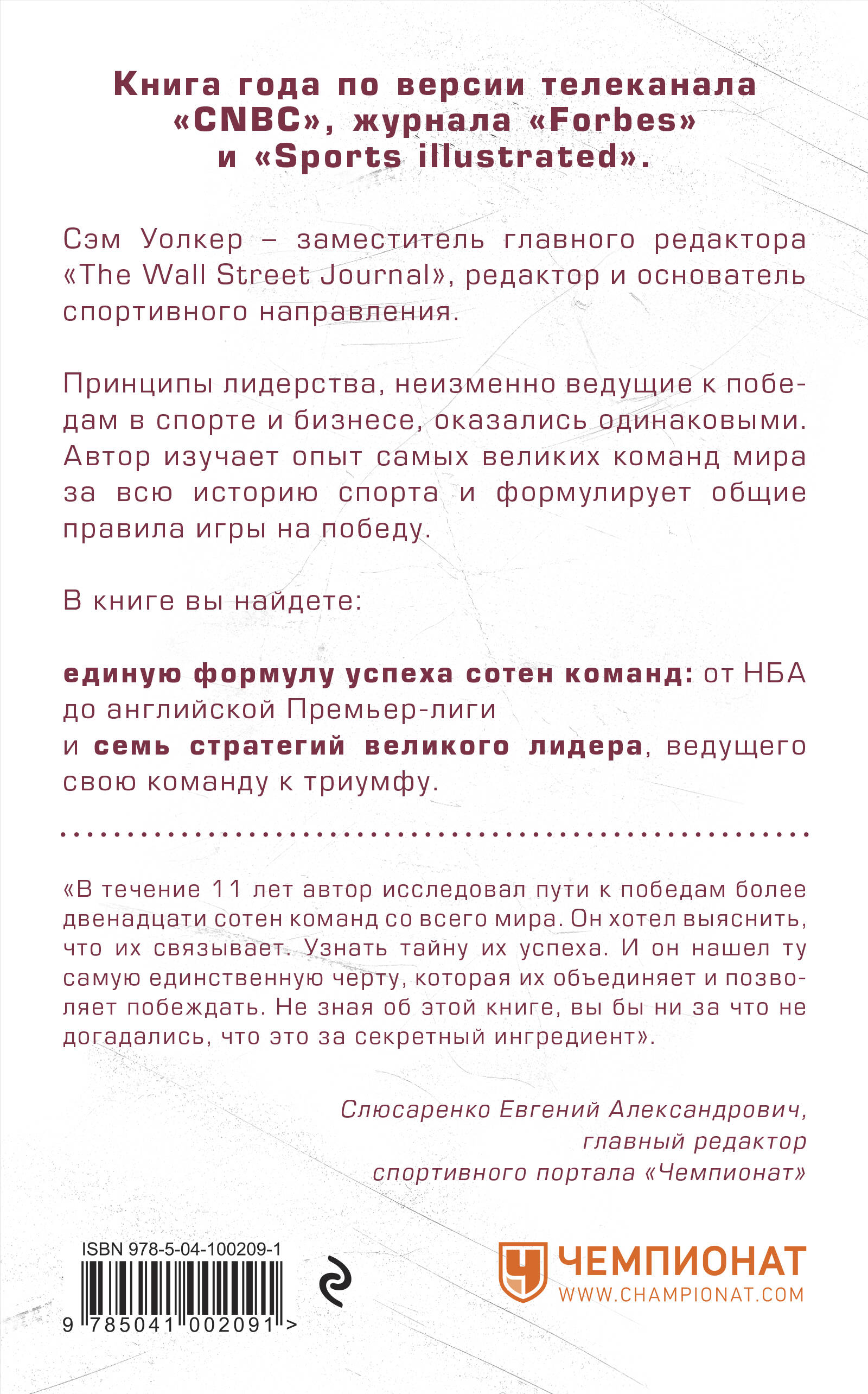 Сэм Уолкер - заместитель главного редактора "The Wall Street Journal", редактор и основатель спортивного направления. Книга года по версии телеканала "CNBC", журналов "Forbes" и "Sports illustrated". Принципы лидерства, неизменно ведущие к победам, для спорта и для бизнеса оказались одинаковыми. Автор изучает опыт самых великих команд мира за всю историю спорта и формулирует общие правила игры на победу. В книге вы найдете: - единую формулу успеха сотен команд: от НБА до английской Премьер-лиги; - семь стратегий великого лидера, ведущего свою команду к триумфу.| Издательство | ООО "Издательство "Эксмо" |