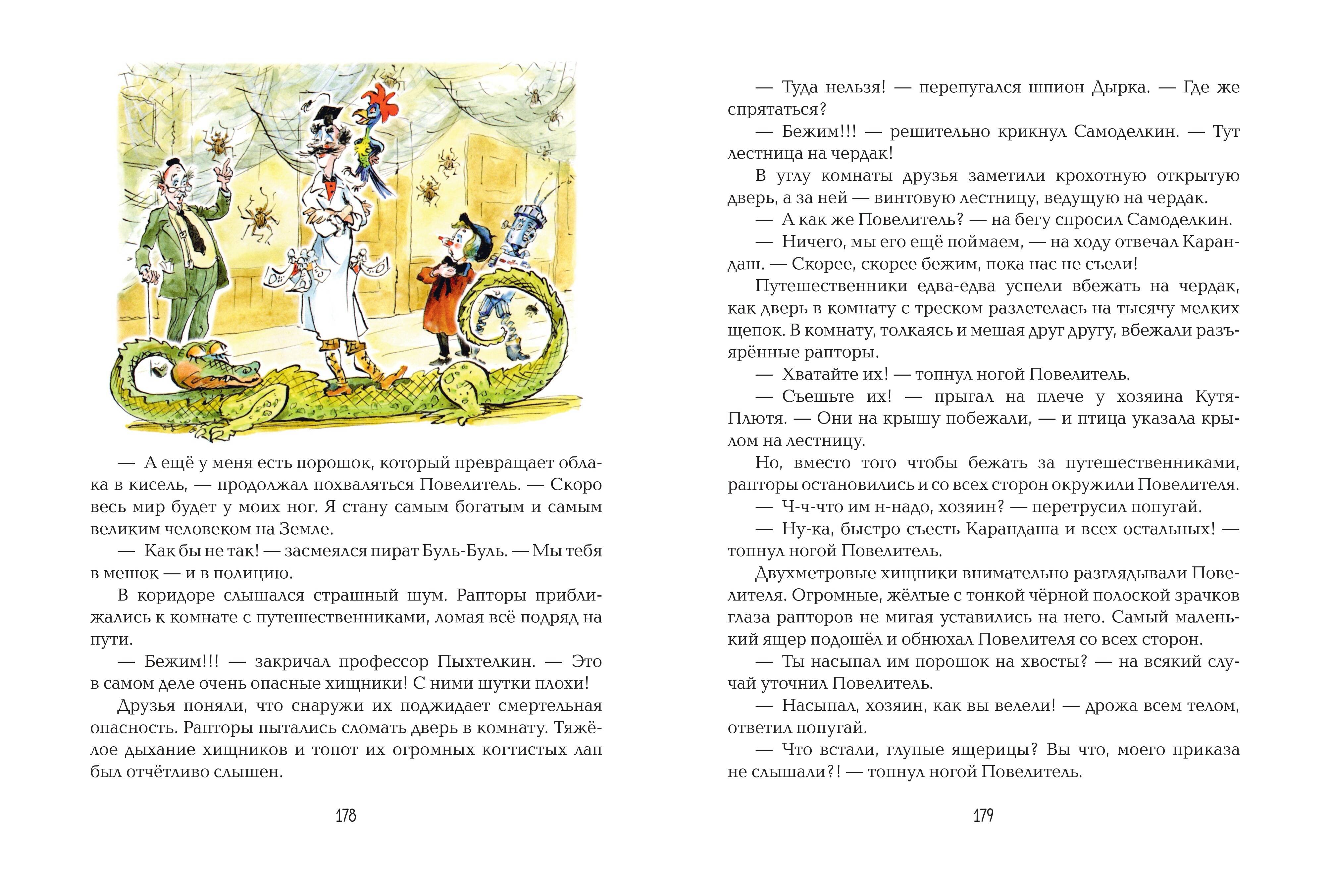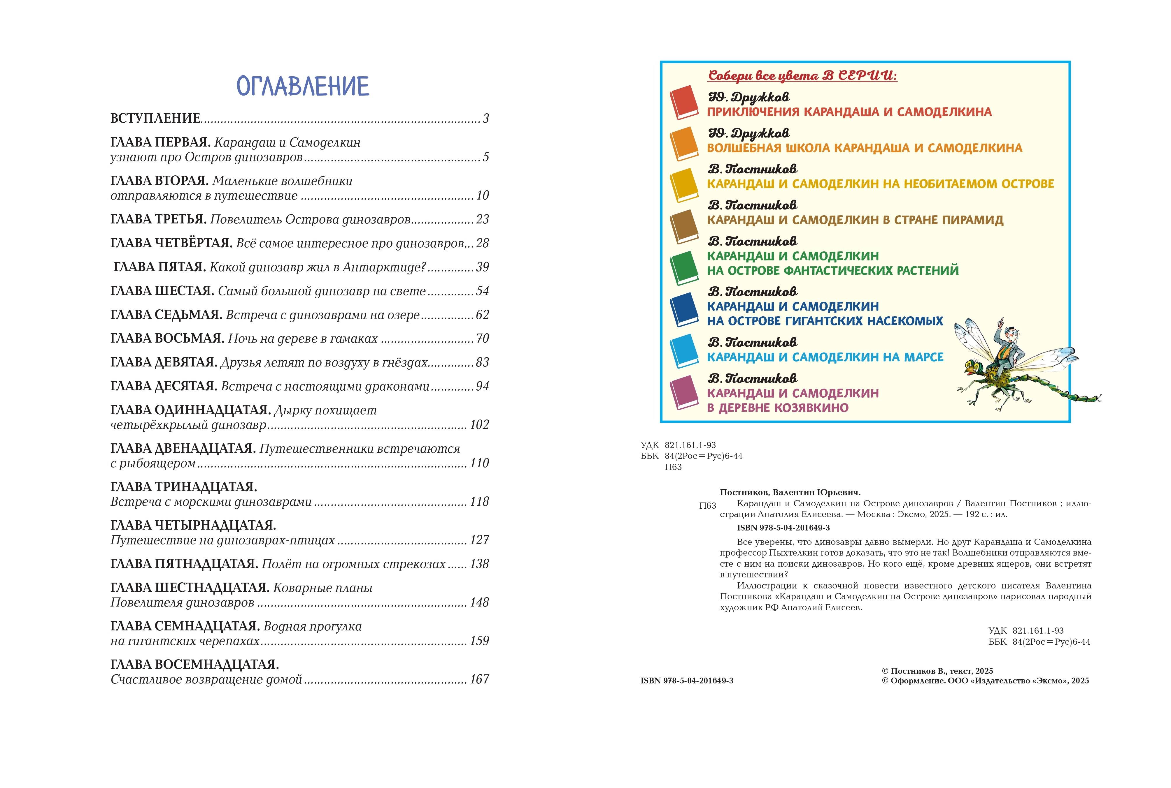 УВЛЕКАТЕЛЬНЫЕ, ПОЗНАВАТЕЛЬНЫЕ, ЯРКИЕ СОВРЕМЕННЫЕ СКАЗКИ С ИЛЛЮСТРАЦИЯМИ ВЫДАЮЩЕГОСЯ МАСТЕРА АНАТОЛИЯ ЕЛИСЕЕВА! Издание удобного формата. Твёрдый переплёт с частичным лаком. Белая бумага. Чёткий, удобный для чтения шрифт. Яркие полноцветные иллюстрации. Мегапопулярные герои отечественной детской классики - волшебный художник Карандаш и железный мастер на все руки Самоделкин - рады новым встречам с читателями всех возрастов! Сенсация! В океане прячется загадочный остров, на котором до сих пор живут настоящие динозавры. Маленьким волшебникам не терпится посмотреть на них. Но, оказывается, у динозавров есть свой Повелитель. И он настроен очень по-злодейски. Больше полувека назад писатель Юрий Дружков рассказал об удивительных событиях, происходивших с весёлыми человечками, в своих книгах «Приключения Карандаша и Самоделкина» и «Волшебная школа Карандаша и Самоделкина». Затем эстафету весёлых приключений принял сын Юрия Дружкова, известный детский писатель Валентин Постников. Благодаря его неистощимой фантазии любимые герои побывают в самых необыкновенных уголках Земли и в космосе, встретятся с динозаврами и даже… поймают привидение! А читатели убедятся, что Валентина Постникова совершенно справедливо называют «самым весёлым современным сказочником». Главной «изюминкой» этих книг стали яркие, остроумные, изящные иллюстрации известнейшего советского и российского художника Анатолия Михайловича Елисеева.