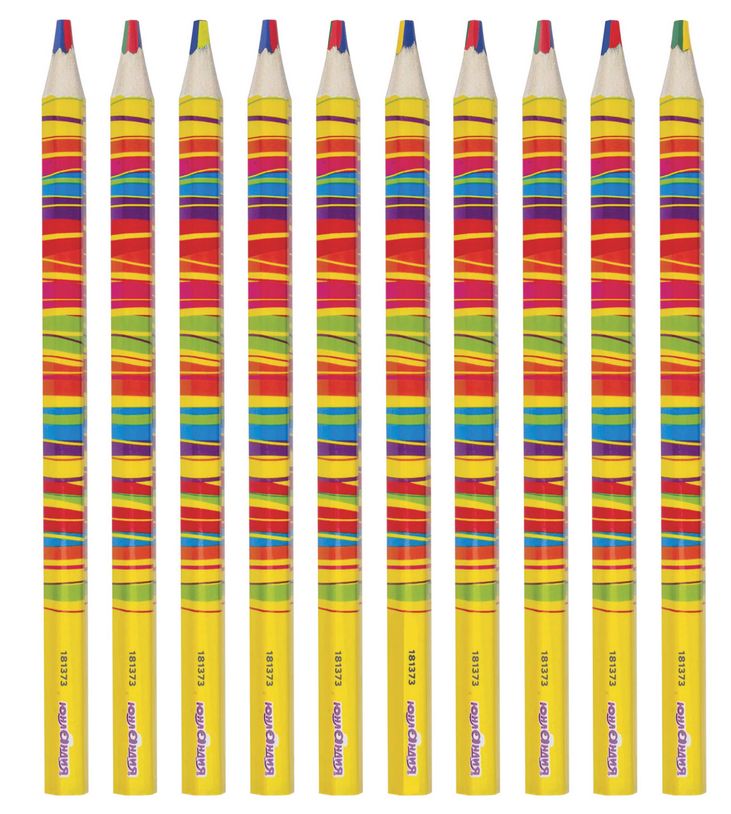 Необычный грифель карандаша сочетает в себе четыре цвета - желтый, зеленый, красный и синий. Утолщенный шестигранный корпус позволяет не скатываться карандашу с поверхности стола во время занятий рисованием и комфортно располагается в руке ребенка. Карандаш изготовлен из высокосортной белой древесины ценных пород. Корпус покрыт цветной печатью. Мягкий грифель из натуральных материалов и пигментов диаметром 5 мм обладает повышенной прочностью.