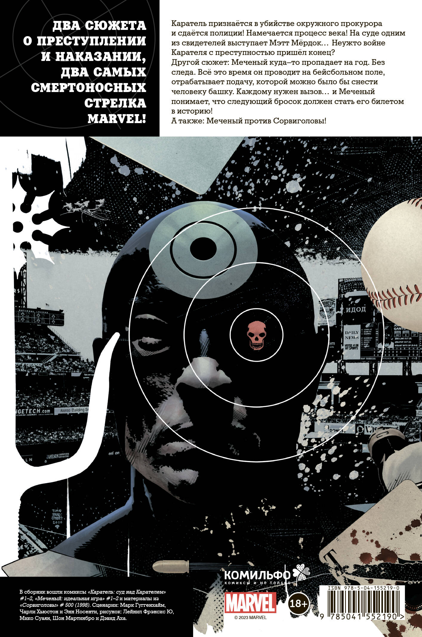 Два сюжета о преступлении и наказании, два самых смертоносных стрелка Marvel! Каратель признаётся в убийстве окружного прокурора и сдаётся полиции! Намечается процесс века! На суде одним из свидетелей выступает Мэтт Мёрдок… Неужто войне Карателя с преступностью пришёл конец? Другой сюжет: Меченый куда-то пропадает на год. Без следа. Всё это время он проводит на бейсбольном поле, отрабатывает подачу, которой можно было бы снести человеку башку. Каждому нужен вызов… и Меченый понимает, что следующий бросок должен стать его билетом в историю! А также: Меченый против Сорвиголовы!| Издательство | ООО "Издательство "Эксмо" |