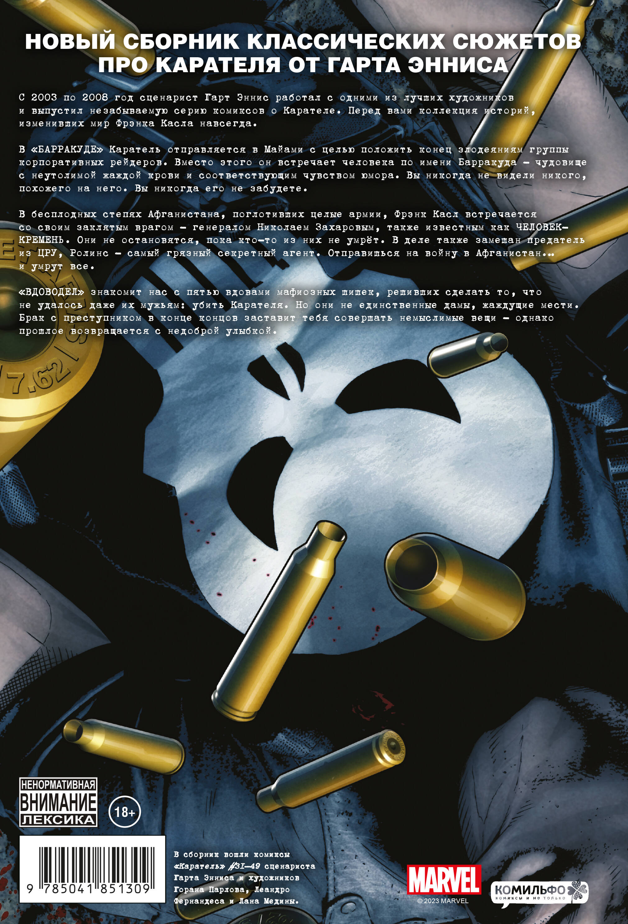 Новый сборник классических сюжетов про Карателя от Гарта Энниса С 2003 по 2008 сценарист Гарт Эннис работал с одними из лучших художников в индустрии - и выпустил незабываемую серию комиксов о Карателе. Перед вами истории, изменившие мир Фрэнка Касла навсегда. В «БАРРАКУДЕ» Каратель отправляется в Майами, с целью положить конец злодеяниям группы корпоративных рейдеров. Вместо этого он встречает человека по имени Барракуда - чудовище с неутолимой жаждой крови и соответствующим чувством юмора. Вы никогда не видели никого, похожего на него. Вы никогда его не забудете. В бесплодных степях Афганистана, поглотивших целые армии, Фрэнк Касл встречается со своим заклятым врагом - генералом Николаем Захаровым, также известным как ЧЕЛОВЕК-КРЕМЕНЬ. Они не остановятся, пока кто-то из них не умрёт. В деле также замешан предатель из ЦРУ Ролинс - самый грязный секретный агент. Отправишься на войну в Афганистан… и умрут все. «ВДОВОДЕЛ» знакомит нас с пятью вдовами мафиозных шишек, решивших сделать то, что не удалось даже их мужьям: убить Карателя. Но они не единственные дамы, жаждущие мести. Брак с преступником в конце концов заставит тебя совершать немыслимые вещи - однако прошлое возвращается с недоброй улыбкой. В сборник вошли комиксы «Каратель» #31-49 сценариста Гарта Энниса и художников Горана Парлова, Леандро Фернандеса и Лана Медины.| Издательство | ООО "Издательство "Эксмо" |
