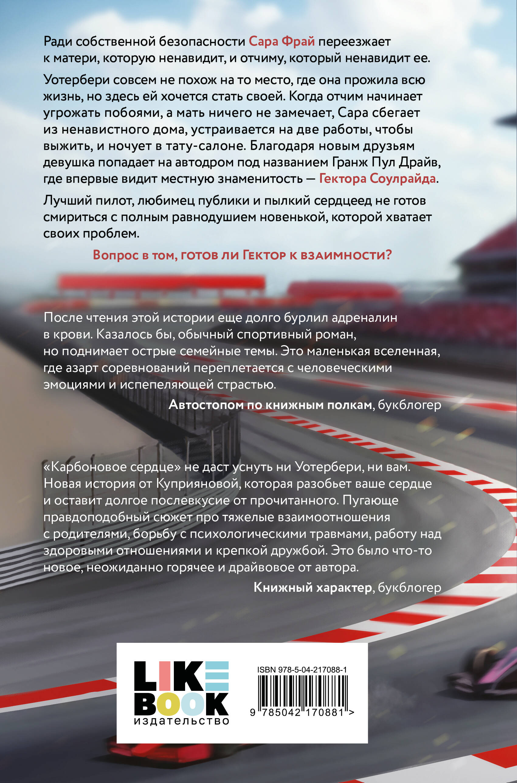 НОВИНКА ОТ АВТОРА КНИЖНОГО ХИТА «ТЬМА ПО СОСЕДСТВУ» МАРЬЯНЫ КУПРИЯНОВОЙ! Я злилась на себя, не веря, что мое сердце выбрало такого неподходящего человека, чтобы так сильно полюбить. Ради собственной безопасности Сара Фрай переезжает к матери, которую ненавидит, и отчиму, который ненавидит ее. Уотербери совсем не похож на то место, где она прожила всю жизнь, но здесь ей хочется стать своей. Когда отчим начинает угрожать побоями, а мать ничего не замечает, Сара сбегает из ненавистного дома, устраивается на две работы, чтобы выжить, и ночует в тату-салоне. Благодаря новым друзьям девушка попадает на автодром под названием Гранж Пул Драйв, где впервые видит местную знаменитость - Гектора Соулрайда. Лучший пилот, любимец публики и пылкий сердцеед не готов смириться с полным равнодушием новенькой, которой хватает своих проблем. Вопрос в том, готов ли Гектор к взаимности? Маленький американский городок, гонщики, любовь-ненависть, любовный треугольник. Шикарный слог автора, яркие персонажи, безупречное художественное оформление не оставят никого равнодушными. «Карбоновое сердце» - история о выборе сердца, а не своего эго. Бывшее название: «Grunge Pool Drive». Для поклонников таких историй, как «Бернаут» Виктории Побединской. Понравится фанатам Солы Рэйн, Авы Хоуп, Эль Кеннеди и Селины Аллен. «После чтения этой истории еще долго бурлил адреналин в крови. Казалось бы, обычный спортивный роман, но поднимает острые семейные темы. Это маленькая вселенная, где азарт соревнований переплетается с человеческими эмоциями и испепеляющей страстью». - Автостопом по книжным полкам, букблогер «"Карбоновое сердце" не даст уснуть ни Уотербери, ни вам. Новая история от Куприяновой, которая разобьет ваше сердце и оставит долгое послевкусие от прочитанного. Пугающе правдоподобный сюжет про тяжелые взаимоотношения с родителями, борьбу с психологическими травмами, работу над здоровыми отношениями и крепкой дружбой. Это было что-то новое, неожиданно горячее и драйвовое от автора». - Книжный характер, букблогер Приятная на ощупь бумага, оригинальная верстка, обложка от известного молодежного художника Kliory Draw.| Издательство | ООО "Издательство "Эксмо" |