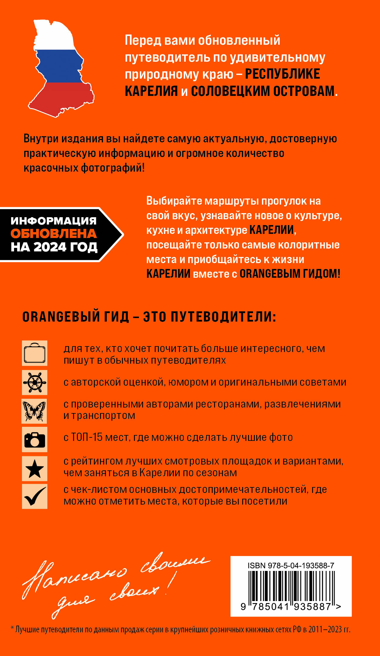 Новое издание путеводителя по Карелии и Соловецким островам серии «Оранжевый гид» - самой разнообразной и популярной серии путеводителей с яркой обложкой. Внутри еще больше красочных фотографий, полезных советов от автора, куда пойти и как провести время в Карелии, маршруты поездок и прогулок. А также чек-лист достопримечательностей, чтобы вы смогли отметить те места, которые успели посмотреть! Отправляйтесь в путешествие вместе с «Оранжевым гидом», который сделает отпуск незабываемым! В гиде содержится актуальная и полезная информация о регионе, советы, как лучше провести свой отпуск, куда сходить, что попробовать, чем заняться, а также список главных достопримечательностей. Здесь вы найдете описания самых интересных мест в Медвежьегорском и Сортавальском районах, Архангельской области, в горном парке Рускеала и многих других районах Карелии. С «Оранжевым гидом» вы успеете всё и не пропустите ничего!| Издательство | ООО "Издательство "Эксмо" |