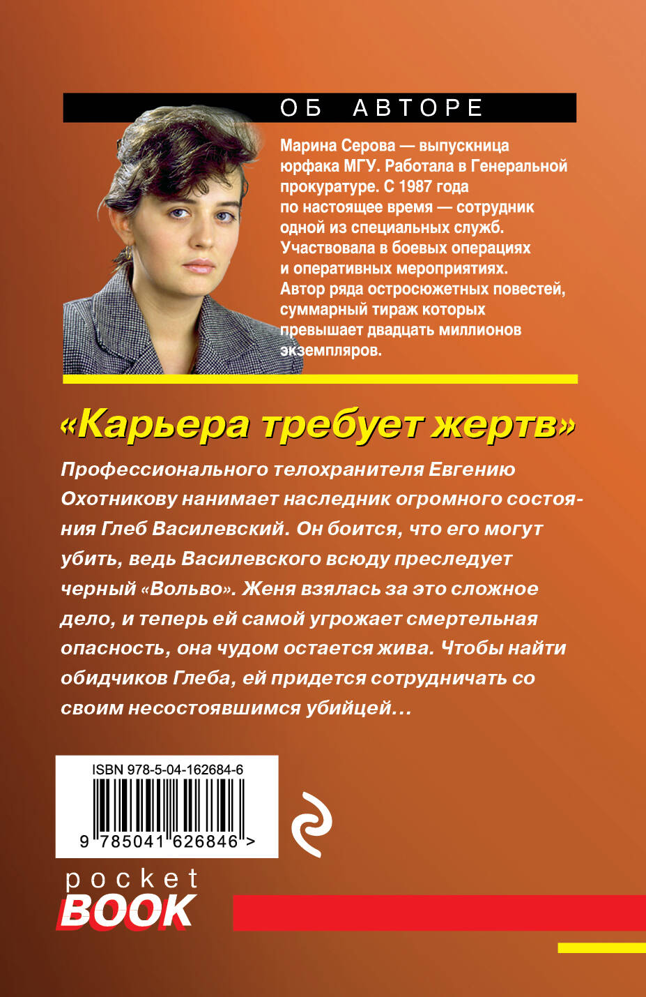 Профессионального телохранителя Евгению Охотникову нанимает наследник огромного состояния Глеб Василевский. Он боится, что его могут убить, ведь Василевского всюду преследует черный «Вольво». Женя взялась за это сложное дело, и теперь ей самой угрожает смертельная опасность, она чудом остается жива. Чтобы найти обидчиков Глеба, ей придется сотрудничать со своим несостоявшимся убийцей… Конечно, Женя Охотникова будет до конца защищать своего клиента, ведь так гласит негласный кодекс телохранителей, и распутает это дело, чего бы ей это ни стоило… Марина Серова - феномен современного отечественного детективного жанра. Выпускница юрфака МГУ, работала в Генеральной прокуратуре. С 1987 года по настоящее время - сотрудник одной из специальных служб. Участвовала в боевых операциях и оперативных мероприятиях. Автор ряда остросюжетных повестей, суммарный тираж которых превышает двадцать миллионов экземпляров.| Издательство | Эксмо |