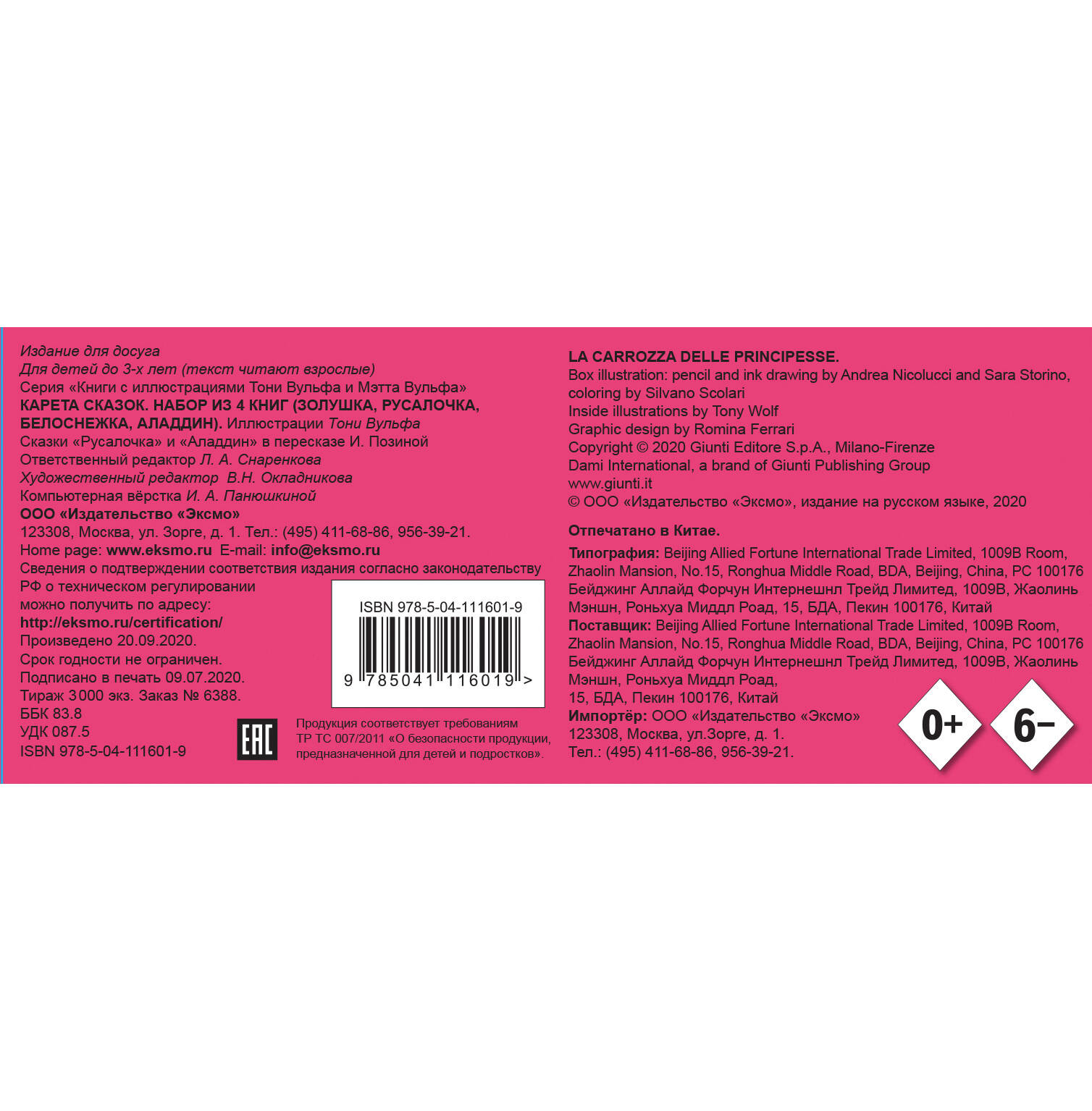 Что подарить юной принцессе? Этот набор с добрыми сказками станет отличным подарком! Футляр выполнен в виде кареты, так что ваша принцесса сможет с удовольствием не только держать в руках маленькие книжечки и листать их плотные странички, но и играть с каретой, и даже сажать в него и катать по комнате свои любимые игрушки. В набор входят мини-книжки «Золушка», «Русалочка», «Белоснежка», «Аладдин». Сказки проиллюстрированы Тони Вульфом, в каждой книжечке - нарядная пухлая обложка, плотные мелованные страницы и множество иллюстраций.| Издательство | ООО "Издательство "Эксмо" |