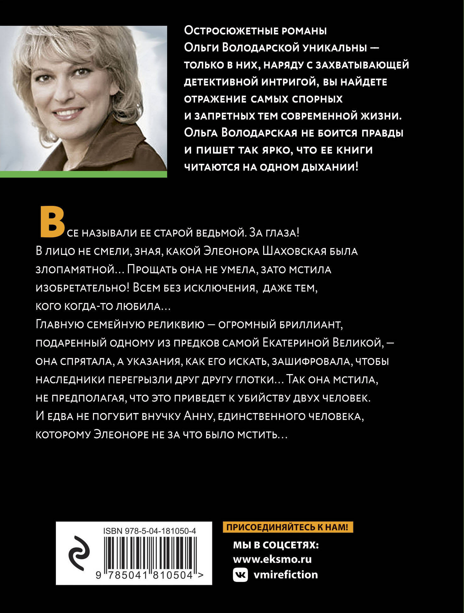 Все называли ее старой ведьмой. За глаза! В лицо не смели, зная, какой Элеонора Шаховская была злопамятной… Прощать она не умела, зато мстила изобретательно! Всем без исключения, даже тем, кого когда-то любила… Главную семейную реликвию - огромный бриллиант, подаренный одному из предков самой Екатериной Великой - она спрятала, а указания, как его искать, зашифровала, чтобы наследники перегрызли друг другу глотки… Так она мстила, не предполагая, что это приведет к убийству двух человек. И едва не погубит внучку Анну, единственного человека, которому Элеоноре не за что было мстить... Романы Ольги Володарской - остросоциальные детективы, в которых автор препарирует все стороны жизни современного общества, ничего не скрывая и ни о чем не умалчивая. Ее книги написаны так увлекательно, что оторваться просто невозможно. Яркий сочный язык и блестящий авторский стиль создают неповторимую атмосферу, в которую с головой погружается читатель.| Издательство | ООО "Издательство "Эксмо" |
