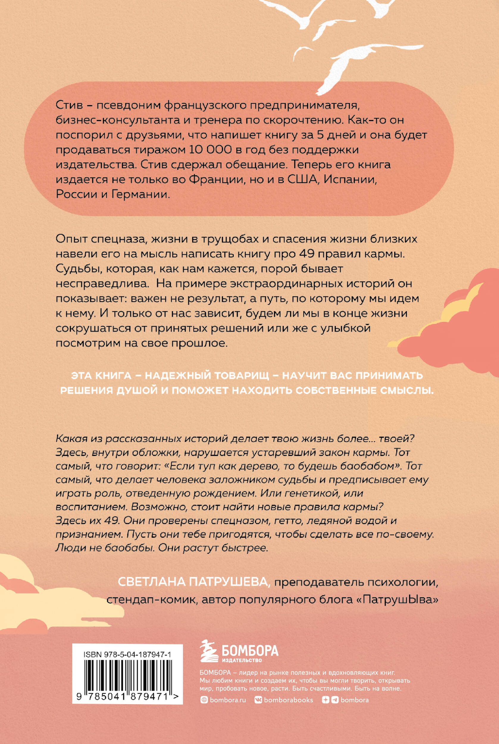 Стив - псевдоним французского предпринимателя, бизнес-консультанта и тренера по скорочтению. Как-то он поспорил с друзьями, что напишет книгу за 5 дней и она будет продаваться тиражом 10 000 в год без поддержки издательства. Стив сдержал обещание. Теперь его книга издается не только во Франции, но и в США, Испании, России и Германии. Опыт спецназа, жизни в трущобах и спасения жизни близких навели его на мысль написать книгу про 49 правил Кармы. Судьбы, которая, как нам кажется, порой бывает несправедлива. На примере экстраординарных историй он показывает: важен не результат, а путь, по которому мы идем к нему. И только от нас зависит, будем ли мы в конце жизни сокрушаться от принятых решений или же с улыбкой посмотрим на свое прошлое. Эта книга - надежный товарищ - научит вас принимать решения душой и поможет находить собственные смыслы.| Издательство | ООО "Издательство "Эксмо" |