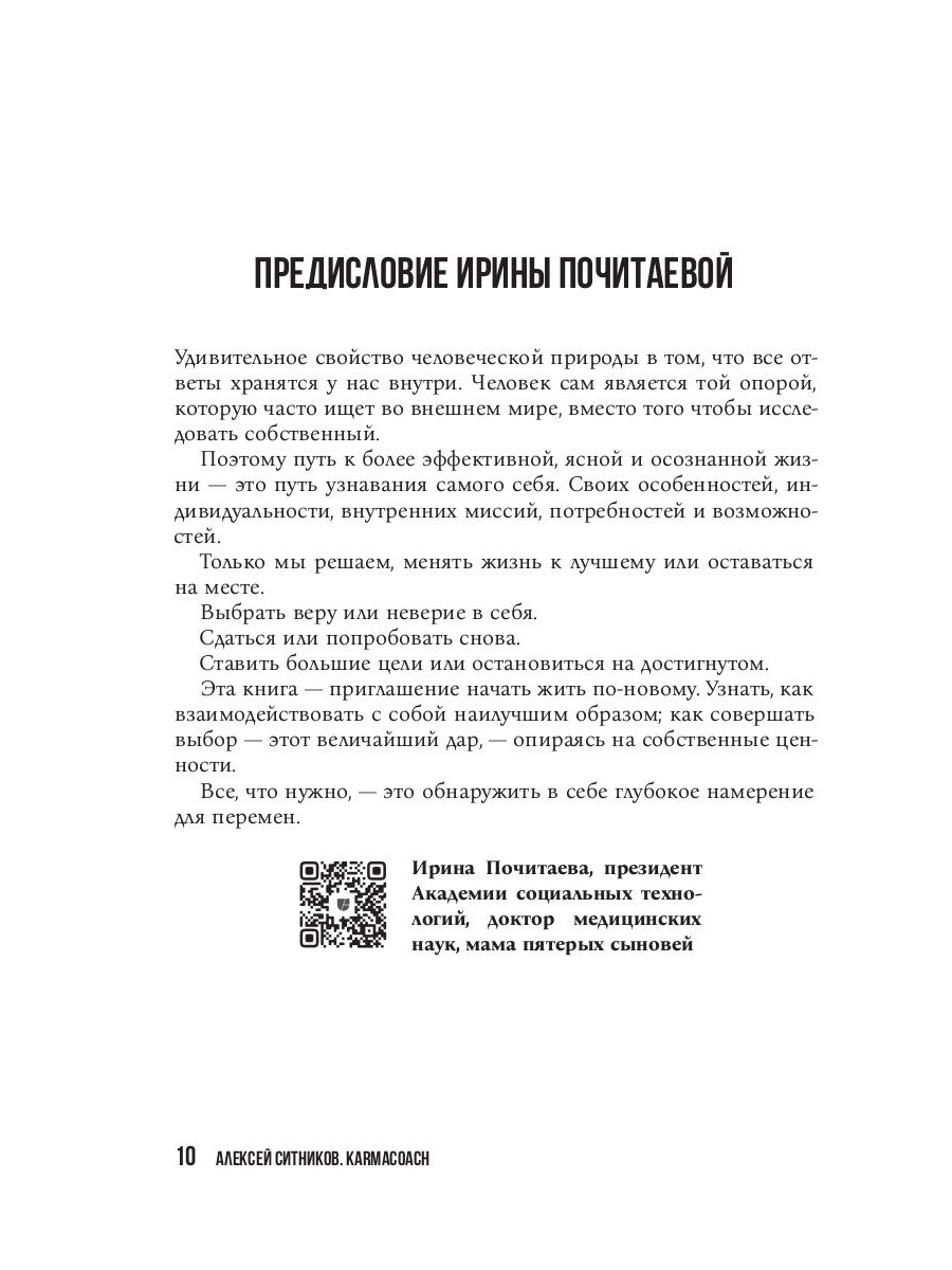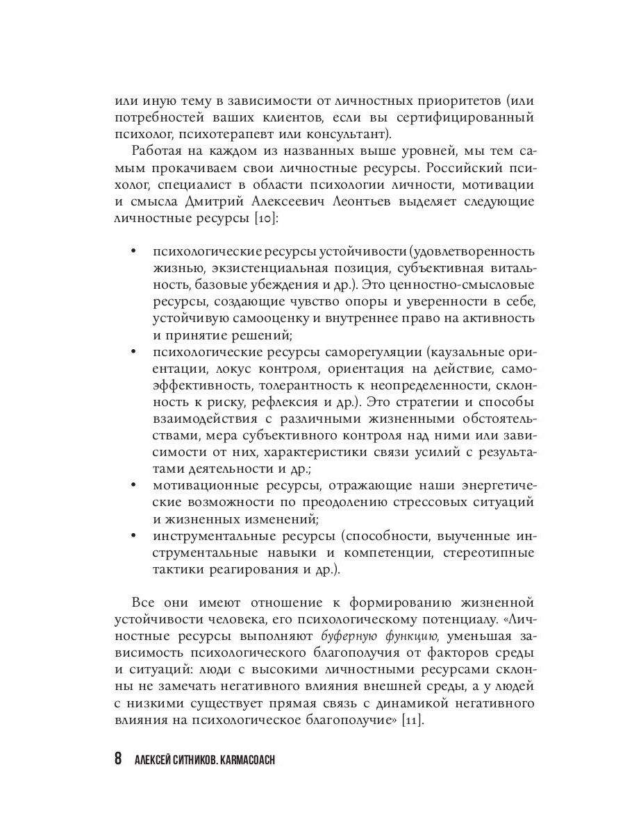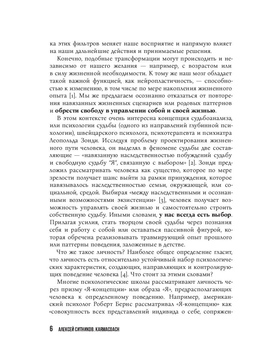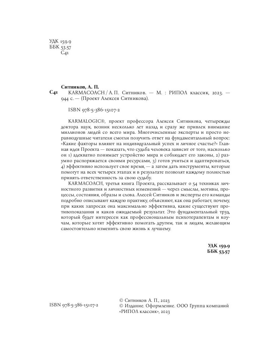 KARMALOGIC®, проект профессора Алексея Ситникова, четырежды доктора наук, возник несколько лет назад и сразу же привлек внимание миллионов людей со всего мира. Многочисленные эксперты и просто неравнодушные читатели смогли получить ответ на фундаментальный вопрос: "Какие факторы влияют на индивидуальный успех и личное счастье?" Главная идея Проекта - показать, что судьба человека зависит от того, насколько он 1) адекватно понимает устройство мира и соблюдает его законы, 2) разумно распоряжается своими ресурсами, 3) готов учиться и адаптироваться, 4) эффективно использует свое время, - а затем дать инструменты, которые помогут на всех четырех этапах и в результате позволят каждому полностью принять ответственность за свою судьбу. KARMACOACH, третья книга Проекта, рассказывает о 54 техниках личностного развития и личностных изменений - через смыслы, мотивы, процессы, состояния, образы и слова. Алексей Ситников и эксперты его команды подробно описывают каждую практику, объясняют, как она работает, почему, при каких запросах она максимально эффективна, какие существуют противопоказания и каков ожидаемый результат. Это фундаментальный труд, который будет интересен как профессиональным психотерапевтам и коучам, которые хотят эффективно помогать другим, так и людям, желающим самостоятельно изменить свою жизнь к лучшему.| Издательство | Рипол Классик |
