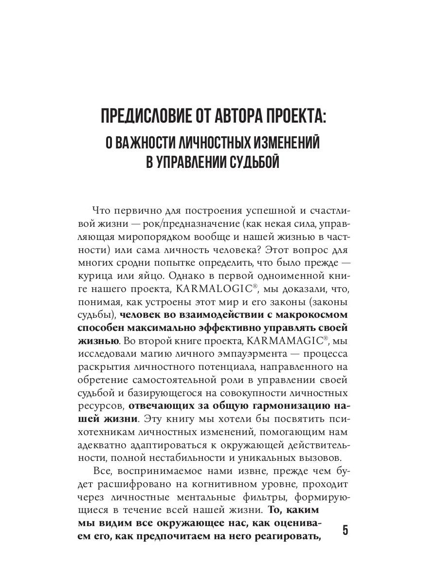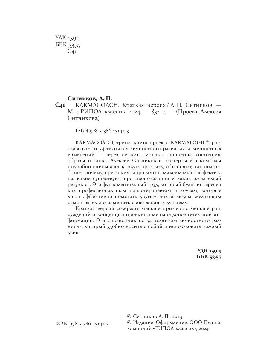 KARMACOACH, третья книга проекта KARMALOGIC®, рассказывает о 54 техниках личностного развития и личностных изменений - через смыслы, мотивы, процессы, состояния, образы и слова. Алесей Ситников и эксперты его команды подробно описывают каждую практику, объясняют, как она работает, почему, при каких запросах она максимально эффективна, какие существуют противопоказания и каков ожидаемый результат. Это фундаментальный труд, который будет интересен как профессиональным психотерапевтам и коучам, которые хотят эффективно помогать другим, так и людям, желающим самостоятельно изменить свою жизнь к лучшему. Краткая версия содержит меньше примеров, меньше рассуждений о концепции Проекта и меньше дополнительной информации. Это справочник по 54 техникам личностного развития, который удобно носить с собой и использовать каждый день.| Издательство | Рипол Классик |