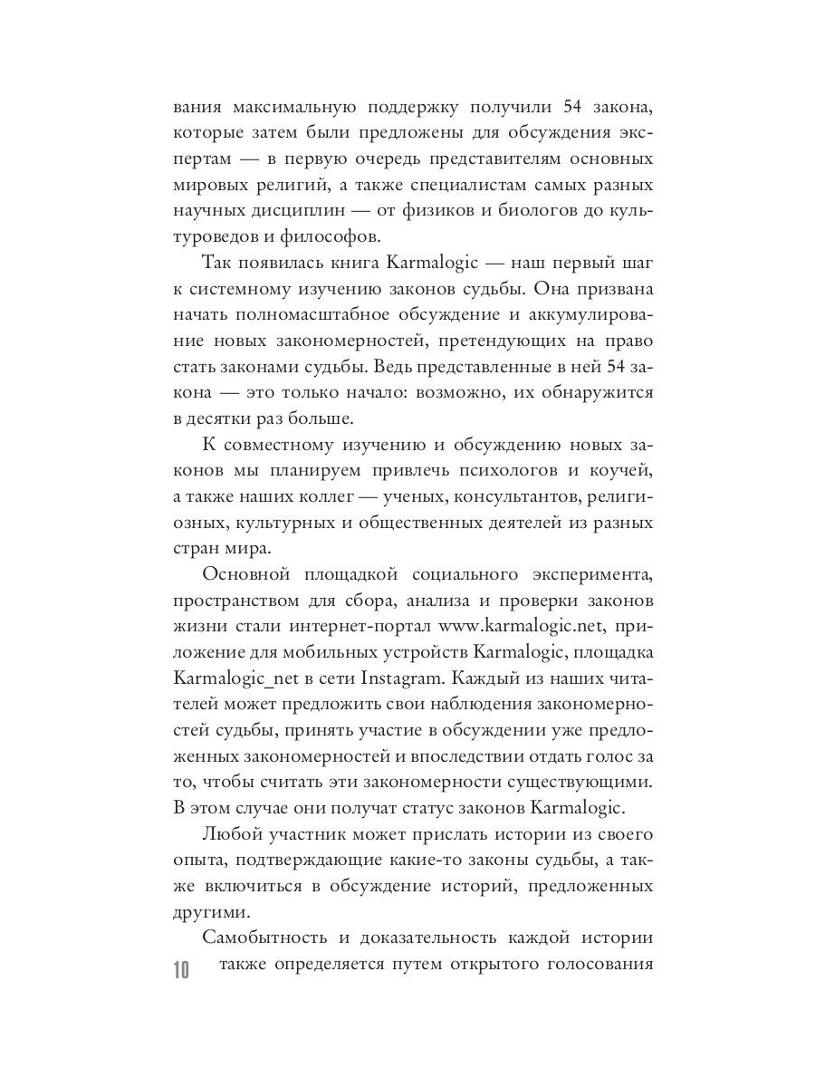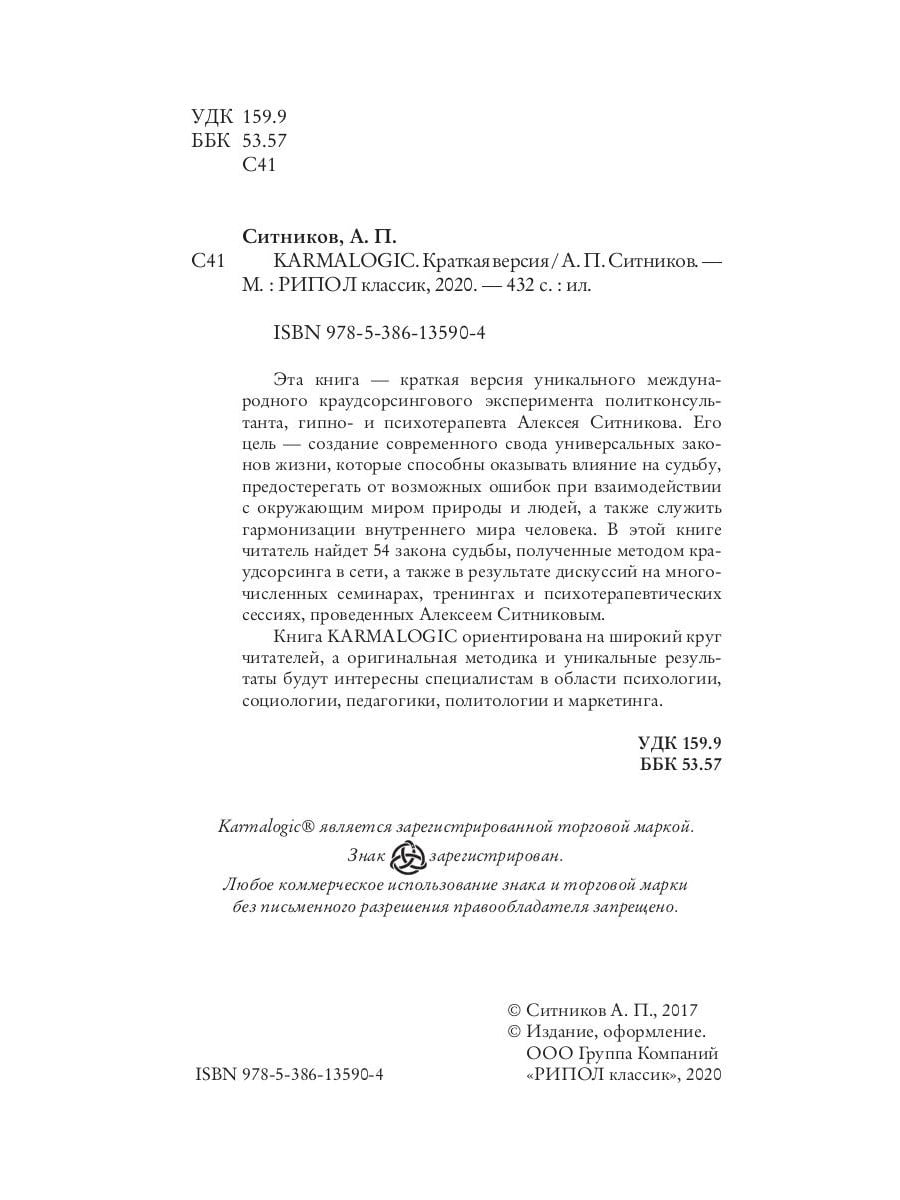 Эта книга - краткая версия уникального международного краудсорсингового эксперимента политконсультанта, гипно- и психотерапевта Алексея Ситникова. Его цель - создание современного свода универсальных законов жизни, которые способны оказывать влияние на судьбу, предостерегать от возможных ошибок при взаимодействии с окружающим миром природы и людей, а также служить гармонизации внутреннего мира человека. В этой книге читатель найдет 54 закона судьбы, полученные методом краудсорсинга в сети, а также в результате дискуссий на многочисленных семинарах, тренингах и психотерапевтических сессиях, проведенных Алексеем Ситниковым. Книга KARMALOGIC ориентирована на широкий круг читателей, а оригинальная методика и уникальные результаты будут интересны специалистам в области психологии, социологии, педагогики, политологии и маркетинга.| Издательство | Рипол Классик |