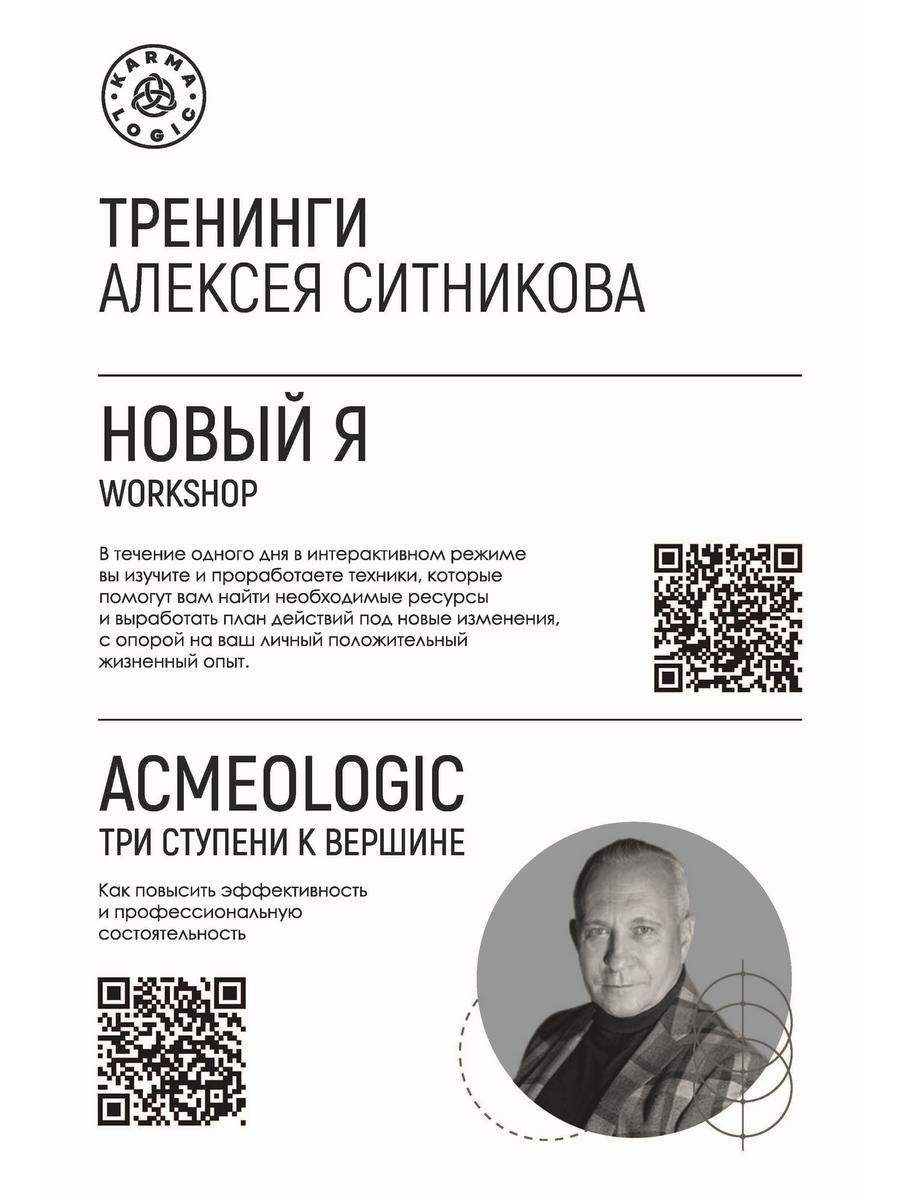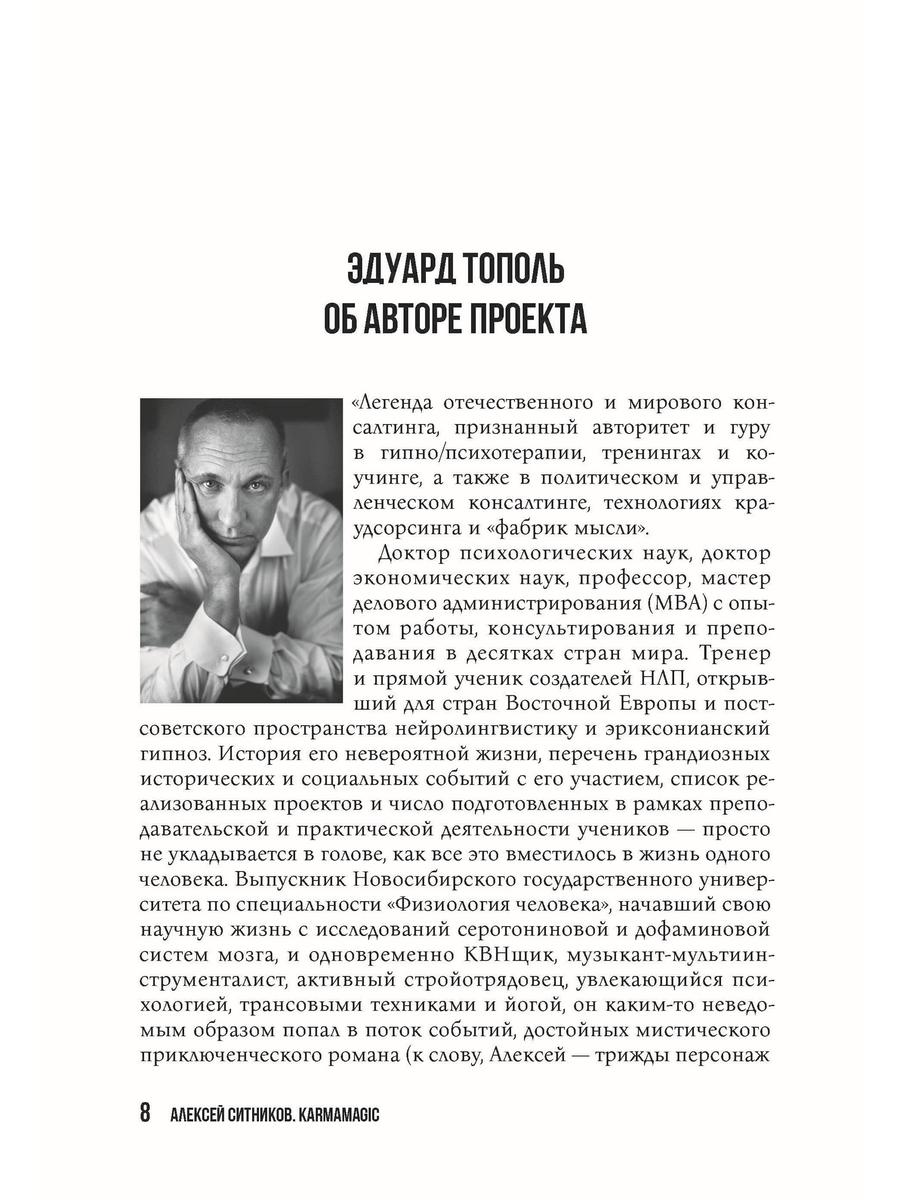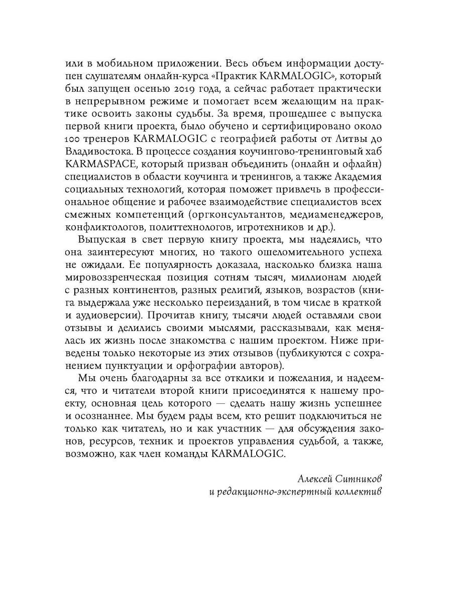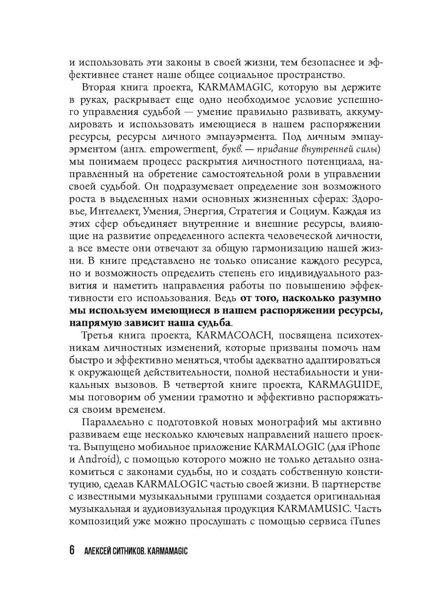 KARMALOGIC®, проект профессора Алексея Ситникова, четырежды доктора наук, возник несколько лет назад и сразу привлек внимание миллионов людей со всего мира. Многочисленные эксперты и неравнодушные читатели смогли получить ответ на фундаментальный вопрос: «Какие факторы влияют на индивидуальный успех и личное счастье?» Главная идея проекта - показать, что судьба человека зависит от того, насколько он 1) адекватно понимает устройство мира и соблюдает его законы, 2) разумно распоряжается своими ресурсами, 3) готов учиться и адаптироваться, 4) эффективно использует свое время, - а затем дать инструменты, которые помогут на всех четырех этапах и в результате позволят каждому принять ответственность за свою судьбу. KARMAMAGIC, вторая книга проекта, рассказывает о 54 ресурсах личного эмпауэрмента, которые формируют такие важные сферы нашей жизни, как здоровье, интеллект, умения, энергия, стратегия и социум. Алексей Ситников и эксперты его команды подробно описывают каждый ресурс, чтобы объяснить, как выстроить прочный фундамент возможностей и откуда взять силы для необходимых изменений.