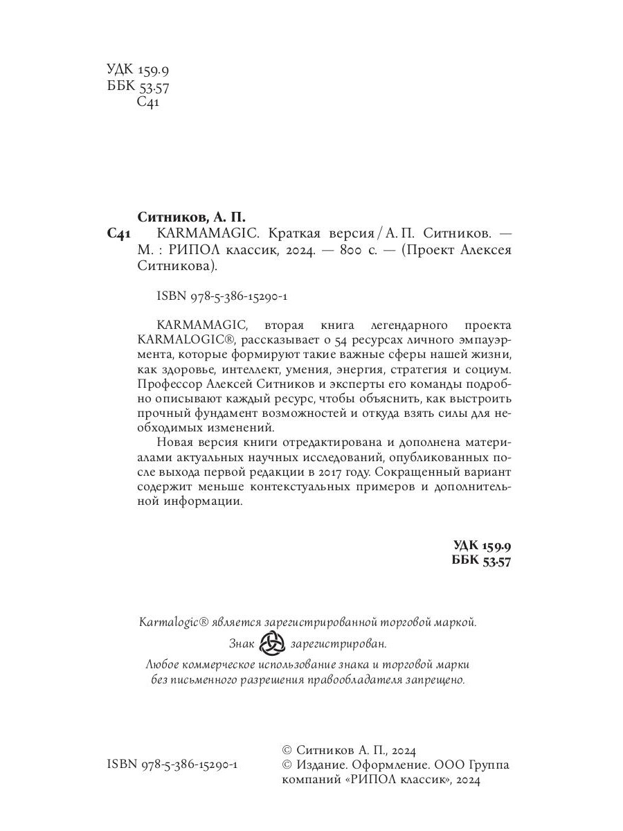 KARMAMAGIC, вторая книга легендарного проекта KARMALOGIC®, рассказывает о 54 ресурсах личного эмпауэрмента, которые формируют такие важные сферы нашей жизни, как здоровье, интеллект, умения, энергия, стратегия и социум. Профессор Алексей Ситников и эксперты его команды подробно описывают каждый ресурс, чтобы объяснить, как выстроить прочный фундамент возможностей и откуда взять силы для необходимых изменений. Новая версия книги отредактирована и дополнена материалами актуальных научных исследований, опубликованных после выхода первой редакции в 2017 году. Сокращенный вариант содержит меньше контекстуальных примеров и дополнительной информации.| Издательство | Рипол Классик |