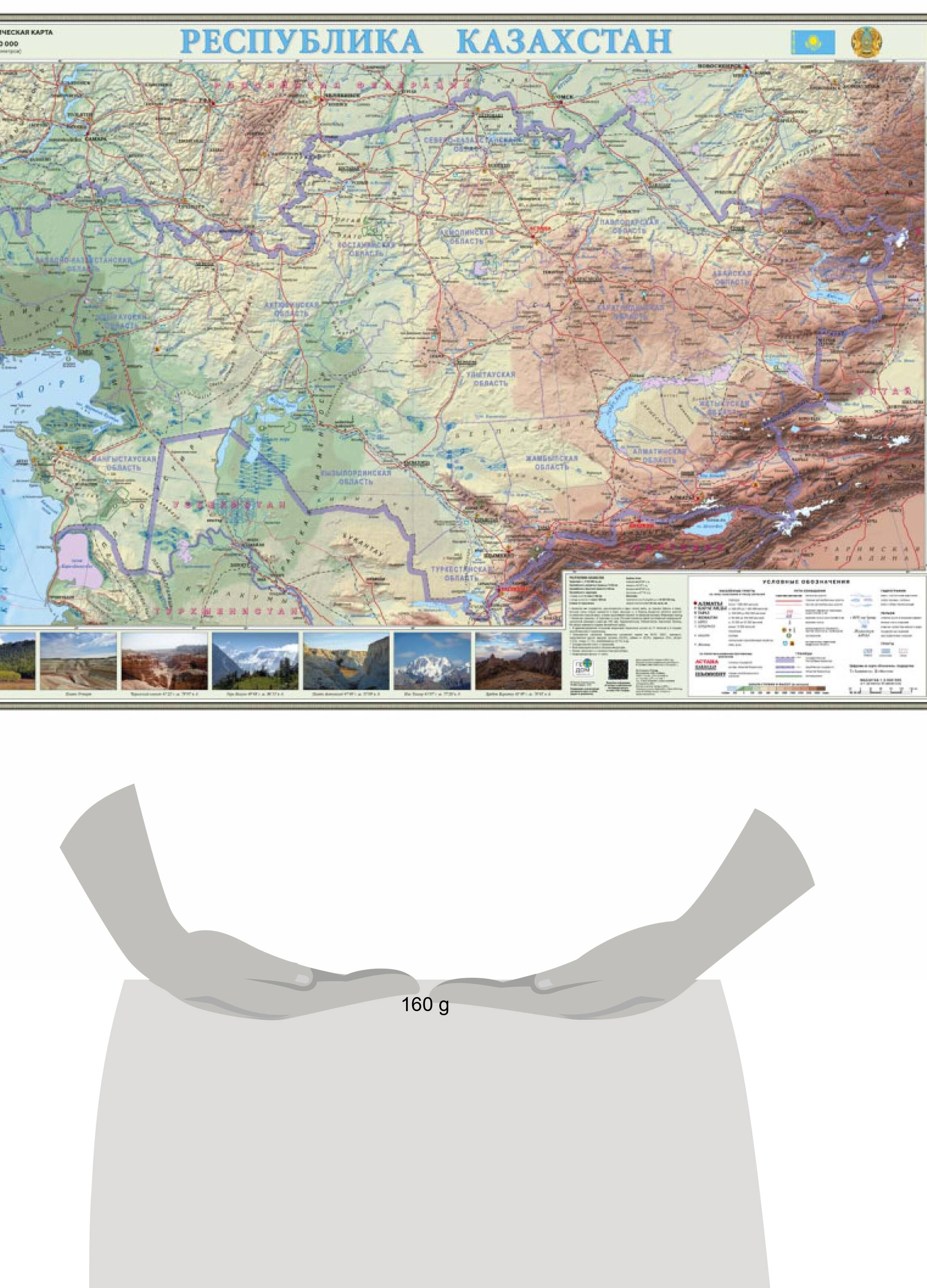 На общегеографической карте отображены географические особенности обширной территории Казахстана и сопредельных территорий стран-соседей. Показаны основные элементы местности - населённые пункты (города, посёлки и сёла), пути сообщения (железные и автомобильные дороги, аэропорты), административное деление территории на области, а так же элементы природного ландшафта - реки, озёра, рельеф и грунты (пески, солончаки, заболоченность). Удобный формат карты 101х69 см позволит расположить её в любом месте, чтобы она всегда была перед глазами. Ламинированное покрытие усиливает насыщенность цвета и обеспечивает карте долговечность.| Издательство | ГеоДом ООО |