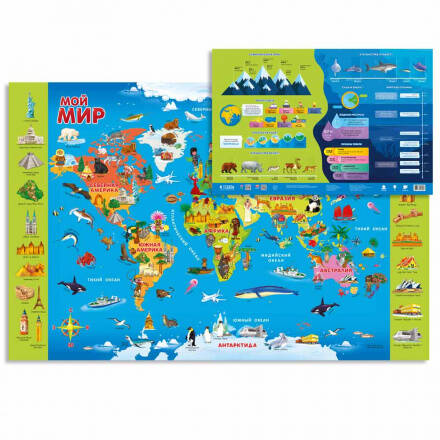 Двухсторонняя карта "Мой мир" познакомит ребенка с окружающим миром. На карте изображены материки и океаны, животные, которые обитают на континентах, а также интересные достопримечательности со всех уголков нашей планеты. Удобный формат карты позволяет расположить ее в любом мест, чтобы карта всегда была под рукой у ребенка.| Издательство | ГеоДом ООО |